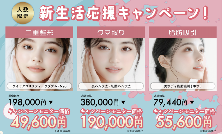 春からの新生活に向けて、二重整形・クマ取り・脂肪吸引のモニター様を【人数限定】で募集します。