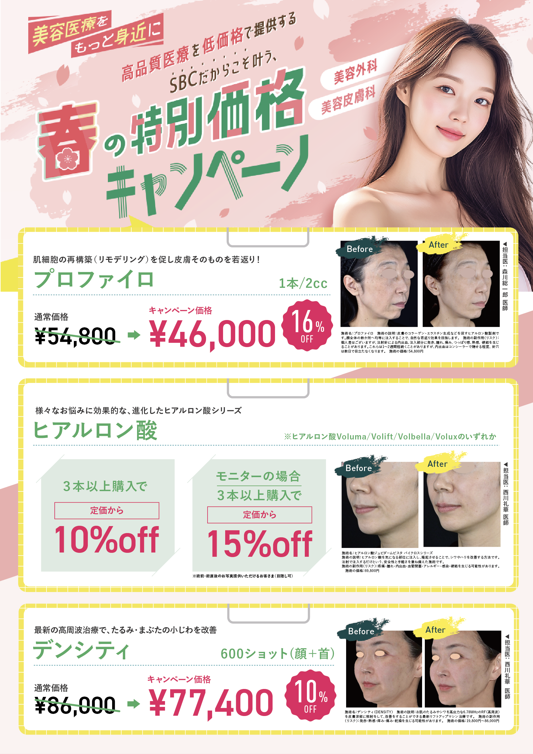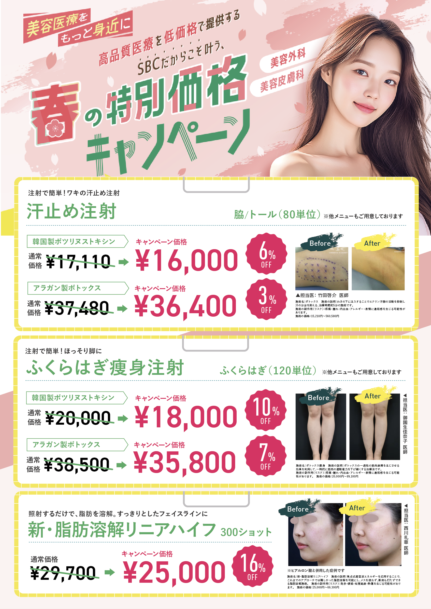 SBCメディカルグループでは、2018年6月1日に施行された医療広告ガイドラインを受け、ホームページ上からの体験談の削除を実施しました。また、症例写真を掲載する際には施術の説明、施術のリスク、施術の価格も表示させるようホームページを全面的に修正しております。当ホームページをご覧の患者様、お客様にはご迷惑、ご不便をおかけ致しますが、ご理解のほどよろしくお願い申し上げます。