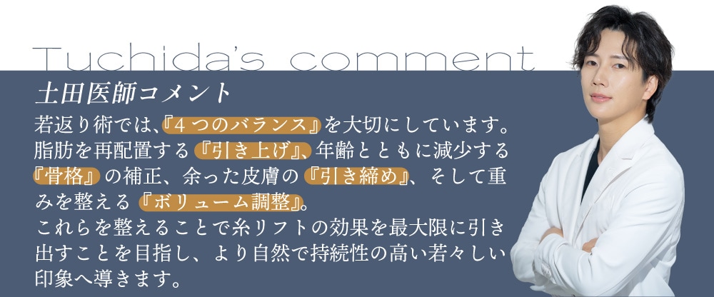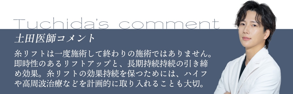 糸リフトは、1回受けて終わりにするよりも、定期的にメンテナンスを行うことで数年後の状態をより良く保つことができます。糸リフトの効果を最大限に引き出し続けるためのポイントを糸リフトの匠・土田博之院長が解説します。