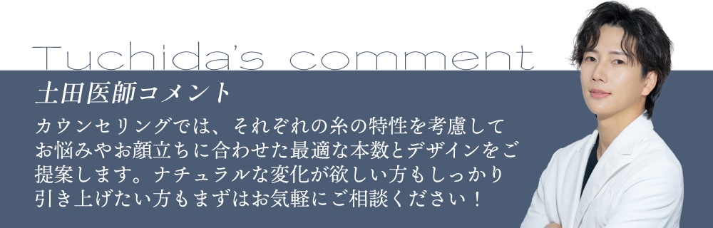 引き上げ力やタイトニング・糸の柔軟性、持続力などそれぞれの糸が持つ特徴と、お顔の特徴や気になる部位によって、糸リフトの種類や本数をカスタマイズしていきます。数種類の糸リフトを組み合わせることで、引き締めとリフトアップの相乗効果を目指します。