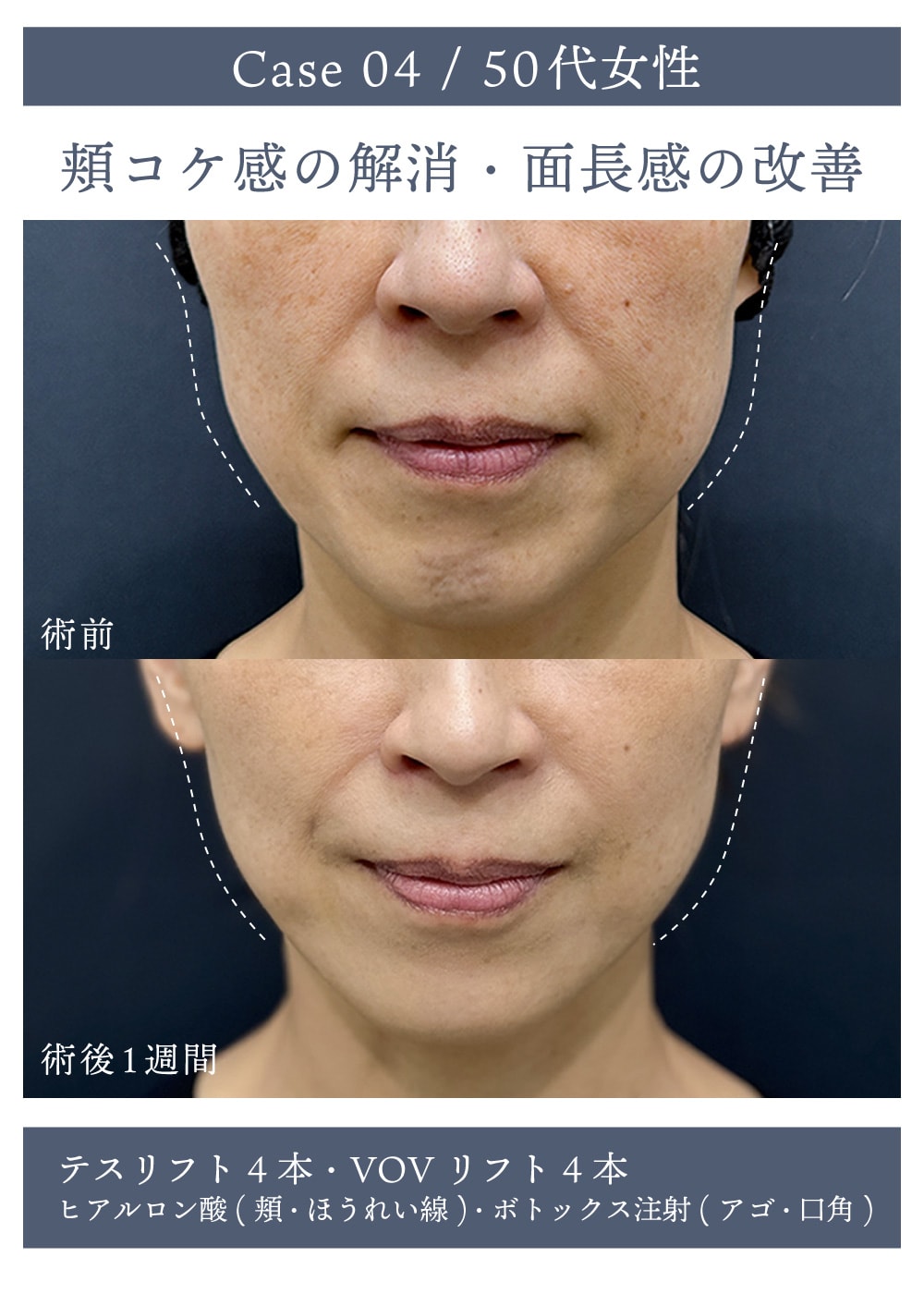 頬コケ、たるみによる面長感を引き上げと引き締めの糸リフトの組み合わせで改善。同時にヒアルロン酸で頬コケを補正し、ボトックス注射で口元の筋肉の働きを緩やかにして表情ジワを改善しました。