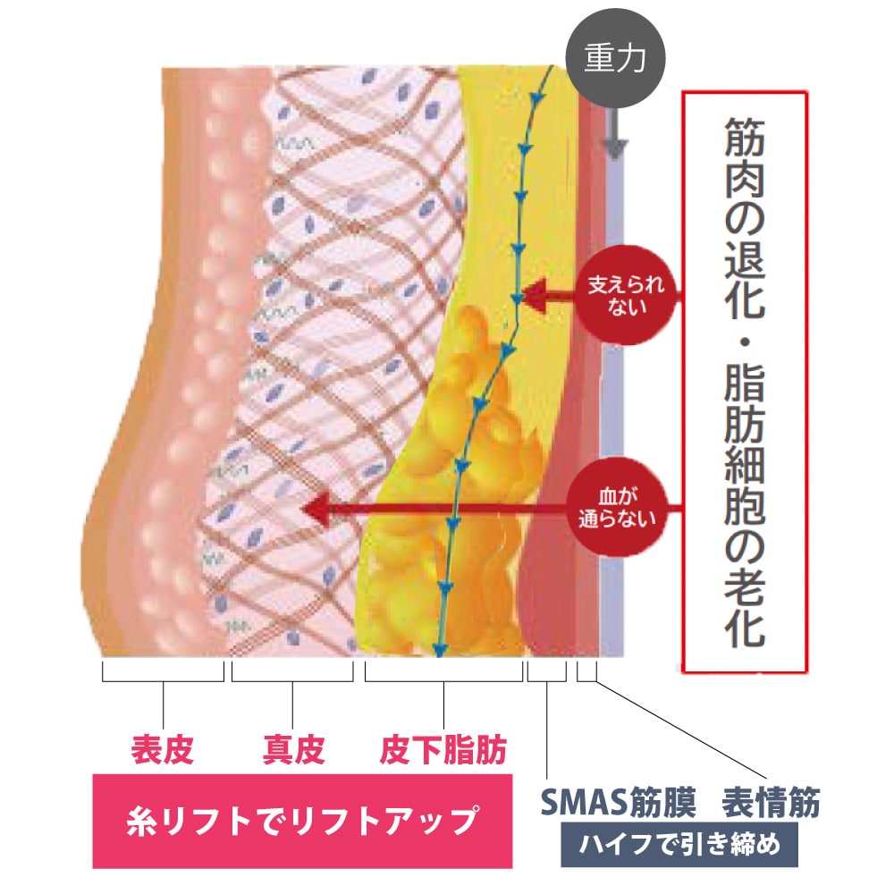 表皮・真皮・皮下脂肪の深い層までアプローチし、リフトアップ効果を図るのが糸リフトです。