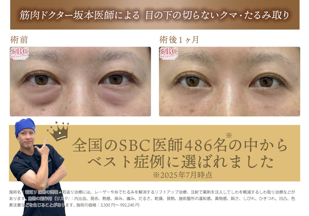 坂本龍亮医師は【目の下のクマ取り】の症例で最優秀賞を受賞!全国のSBC医師486名の中から選ばれました。(ベストショットアワード 2025年9月)お客様とのカウンセリングの時間を大切にする坂本医師。口コミでのご来院が多く、クマ取りだけでなくボトックス注射やヒアルロン酸注入などリピーターのお客様多数。目の下のクマやエイジングサインにお悩みの方は、坂本龍亮医師をご指名ください!
