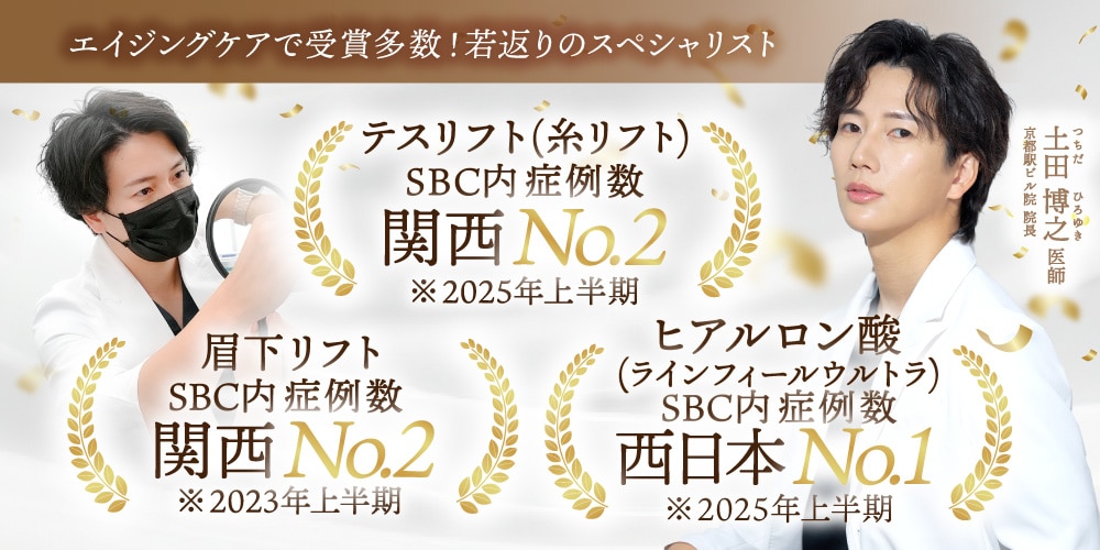 京都駅直結・湘南美容クリニック京都エリア最大級規模の京都駅ビル院。滋賀(大津)から約9分、大阪(高槻)から約13分。京都エリア最大級規模の京都駅ビル院では、二重術・若返り術・小顔整形・脂肪吸引・肌育治療など、各分野で研鑽を積む医師がお客さまの美しさをサポート。SBC京都エリア統括ドクターの土田博之院長を筆頭に、経験豊富なドクターが一人ひとりに合う治療を提案します。