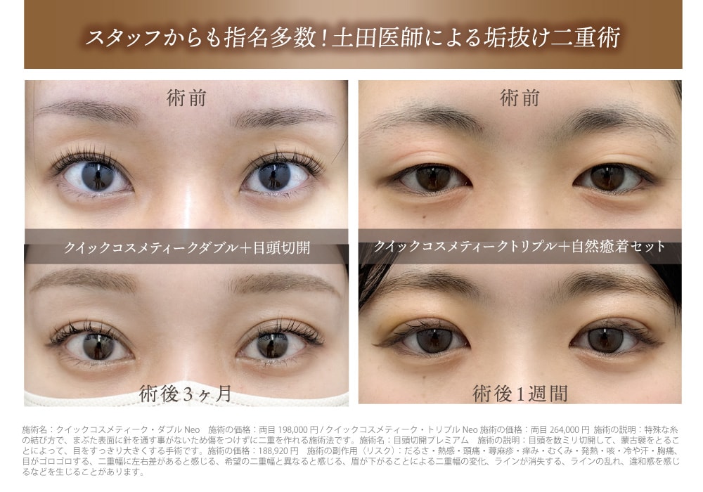 京都はもちろん、滋賀や大阪など他府県からご指名多数!土田院長の二重術は、骨格や目元の状態を丁寧に診察し、豊富なメニューの中からお客様一人ひとりの魅力を最も活かせる術式で、なりたい二重を叶えるご提案をいたします。