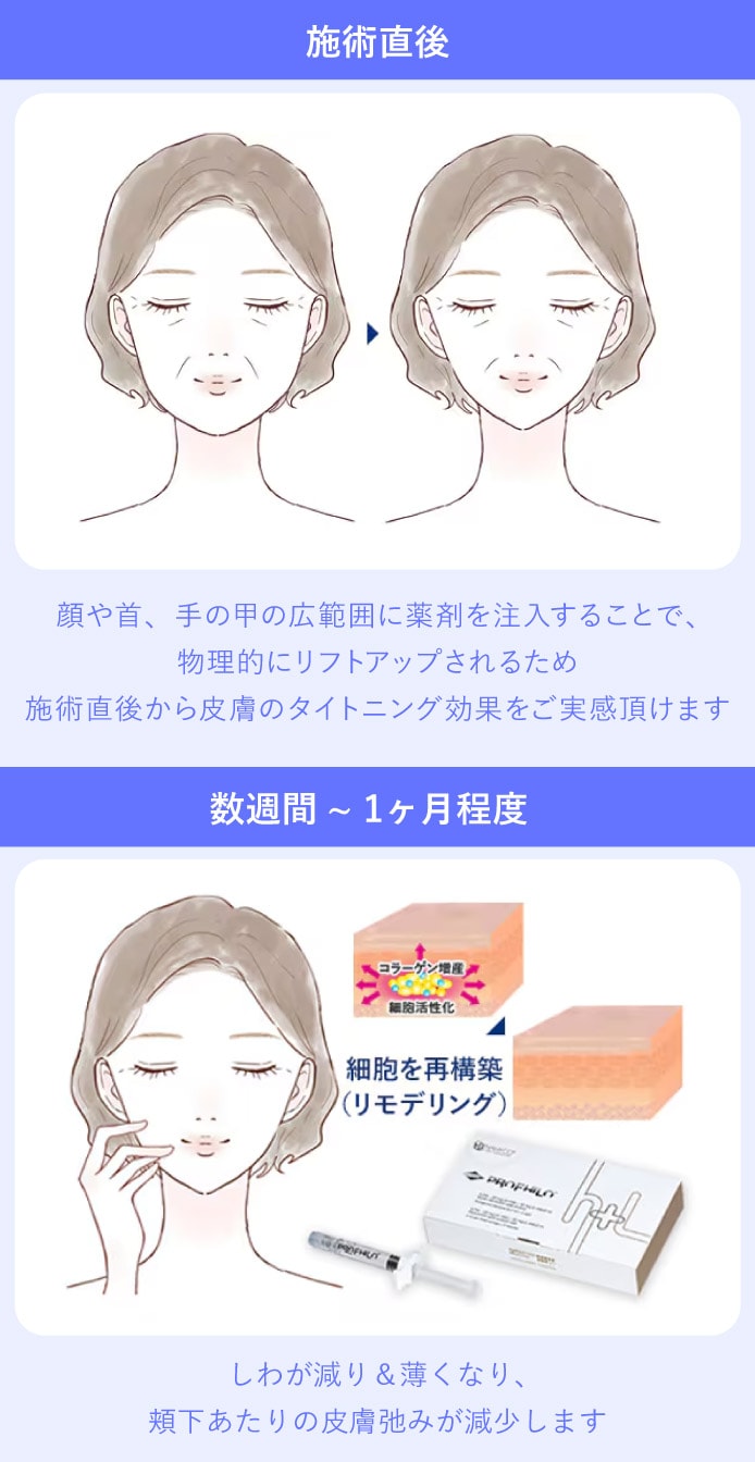 必要な成分を直接肌に注入し、即効性のあるケアを実現します。特にコラーゲンやエラスチンを補うことで、肌のハリや弾力を取り戻します。