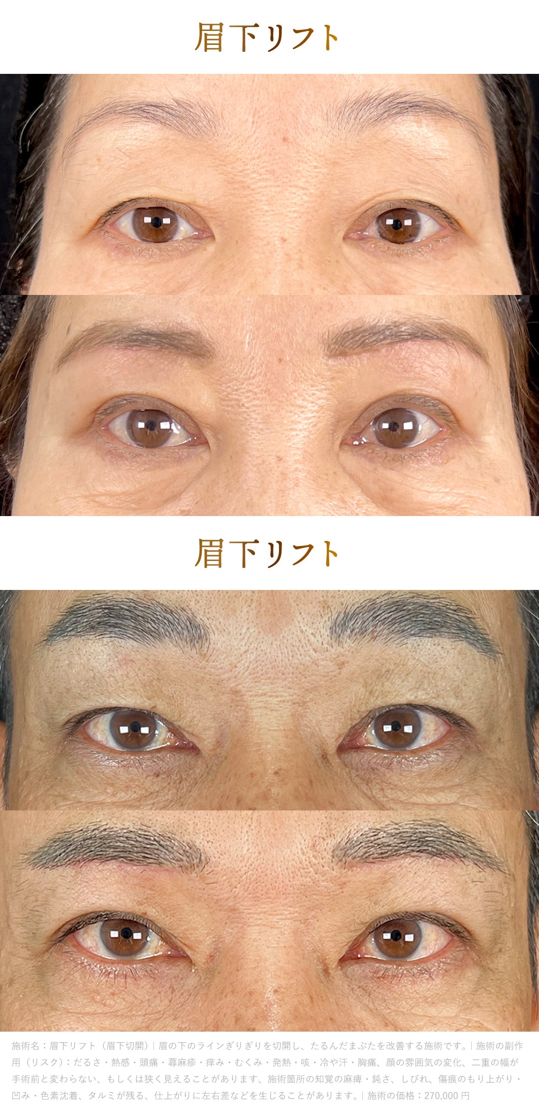 上まぶたのたるみを、眉下で自然にリフトアップ。若々しく、視野も広がる人気の施術です。