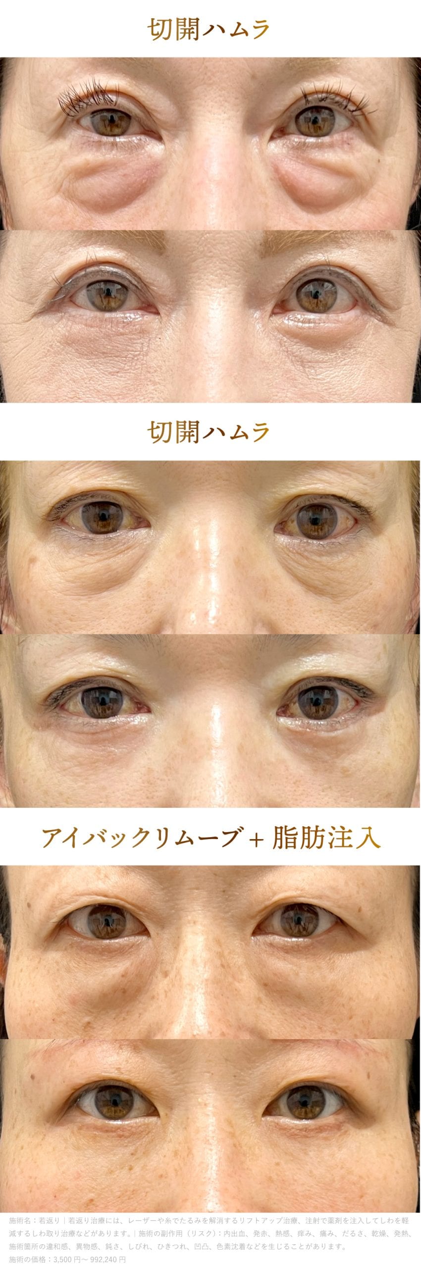 目の下のたるみや皮膚の余りを、脂肪の再配置と同時に解決する、根本的なクマ治療です。