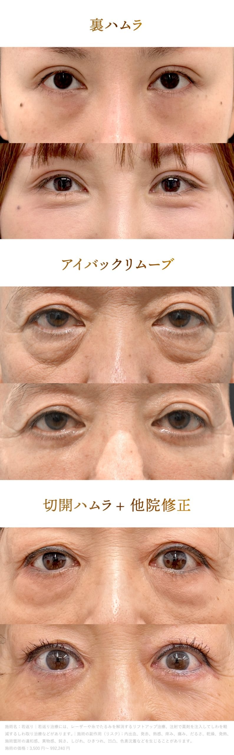 SBC内でも数少ない「クマ取り4大術式」全てに対応。中でも、お顔の表面に傷跡を残さずにクマの根本原因を解決する、高度な技術「裏ハムラ法」を特に得意としています。