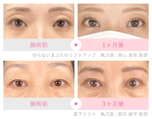 加齢によってたるんだ上まぶたの皮膚を切除(眉下リフトなど)したり、二重術の応用で引き上げる(クイックコスメティーク・ダブルNeoなど)ことで、視界を広くし、若々しくパッチリとした目元を取り戻します。