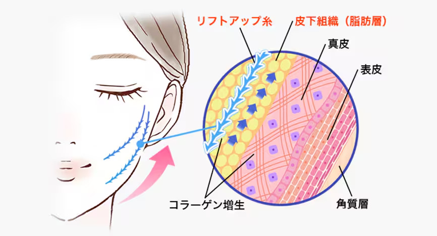 髪の毛ほどの極細吸収糸を皮下に網目状に多数挿入。コラーゲン生成を強力に促進し、肌の内側からハリとツヤ、弾力を高めます。大きなリフトアップよりも、肌質の改善や小じわ対策におすすめです。「ショッピングリフト」とも呼ばれます。