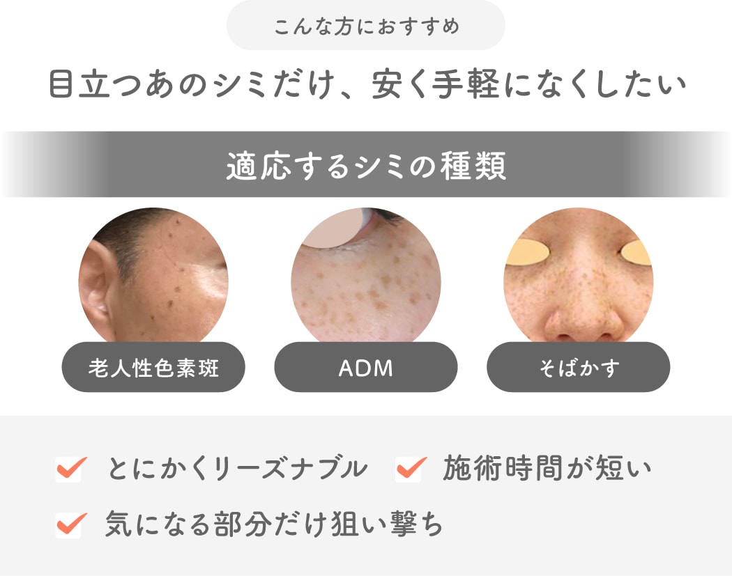 「顔全体ではなく、この大きなシミだけを取りたい」という方に最適な、非常にリーズナブルなプランです。