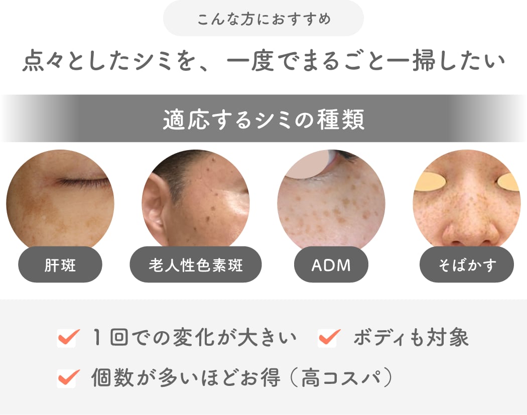 「シミの数が多すぎて数えられない」「そばかすが顔中に散らばっている」という方には、個数無制限の取り放題が圧倒的に高コスパです。