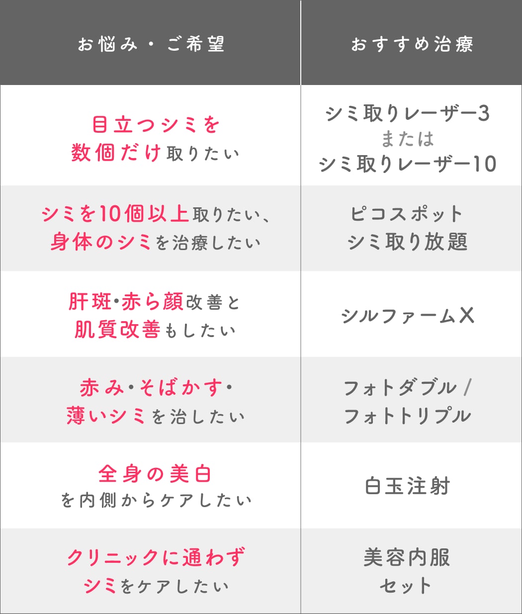 人気の「シミ取り放題」や「レーザー10」をはじめ、肝斑・赤み治療(シルファームX)、内服薬・白玉注射など、すべての美白・肌質改善メニューの価格をこちらのページにまとめました。