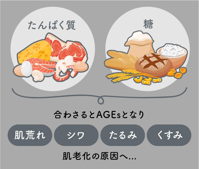 などの肌老化を起こす「AGEs」が発生し、老化を促進させていきます。