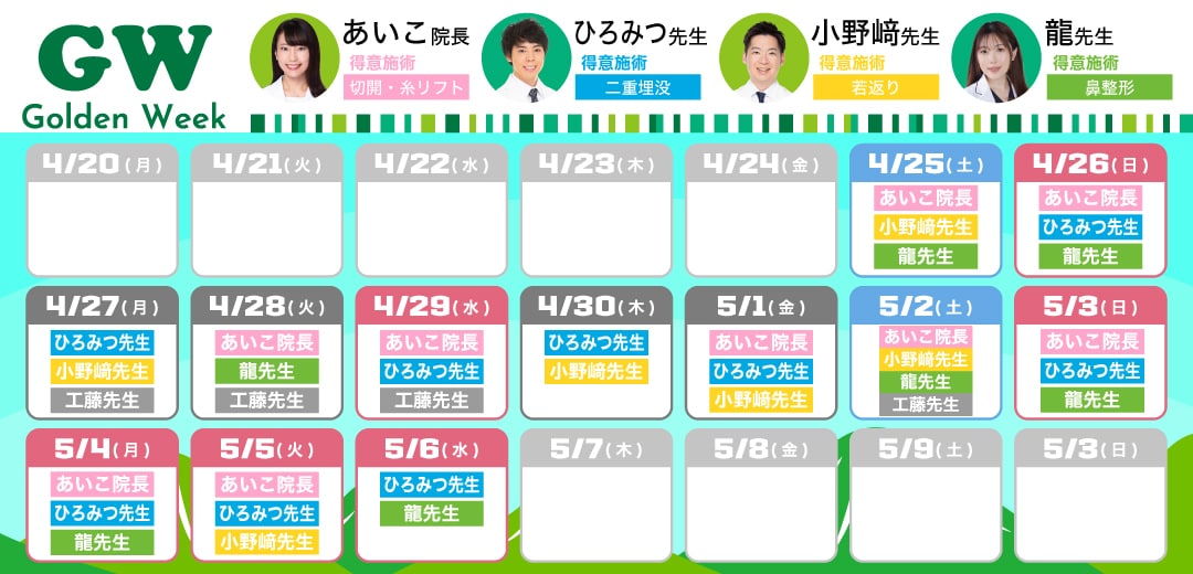 9:00~18:00(最終カウンセリング予約/16:30) ※元旦のみ休診 |