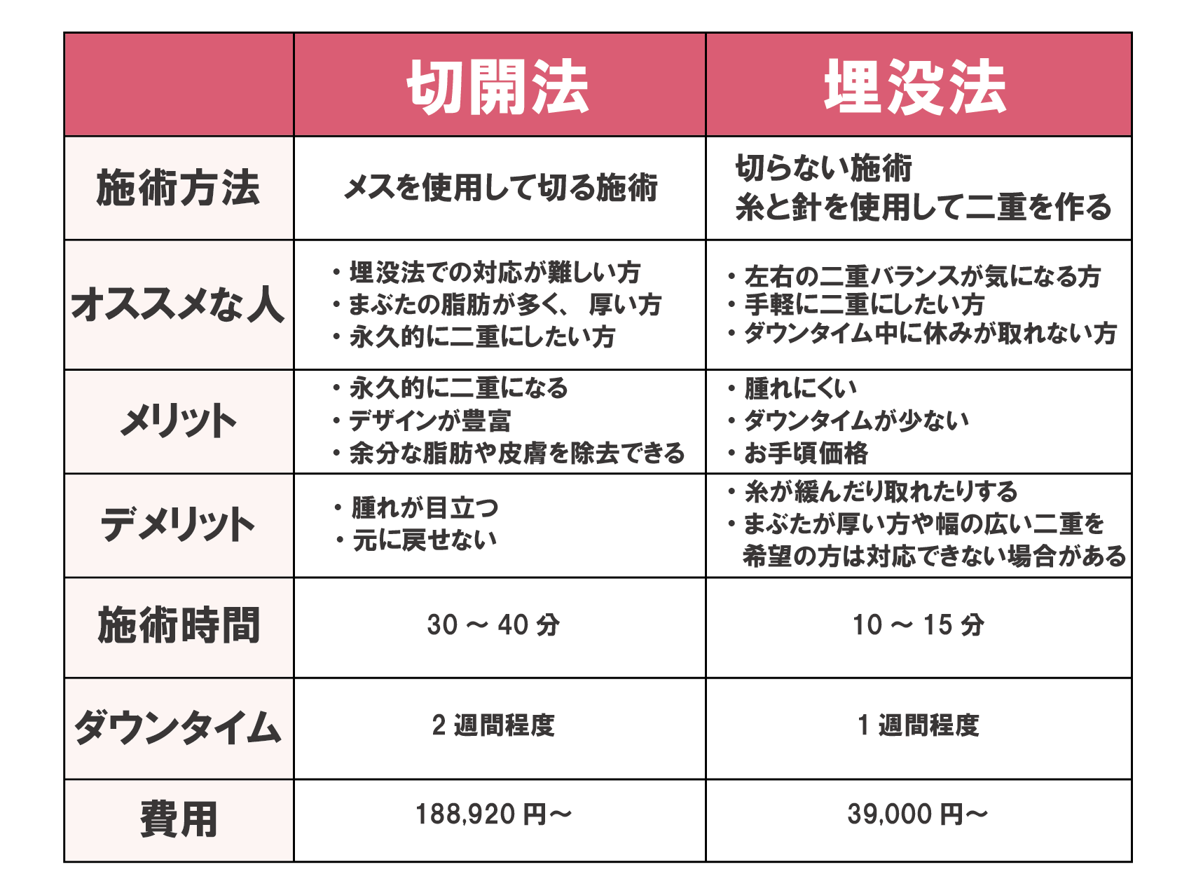 このページでは、埋没法と切開法それぞれの特徴と違いをもとに、