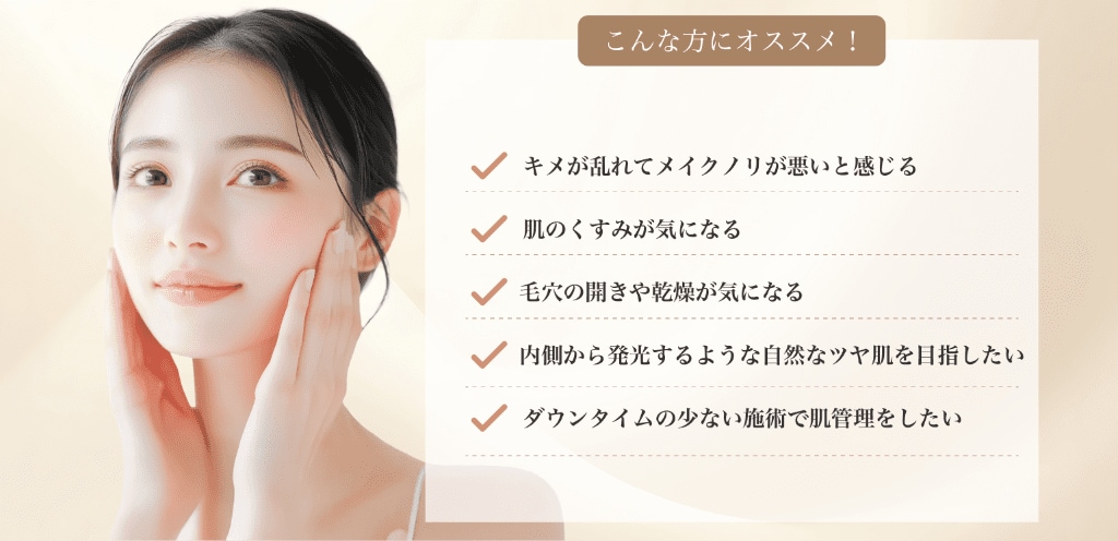 ✔ ダウンタイムが少なく、施術直後から肌のトーンアップやなめらかさを実感できる