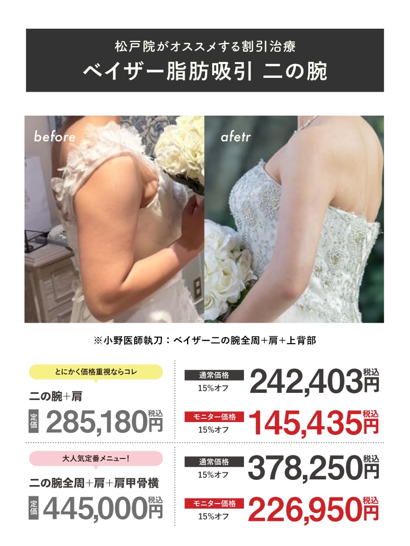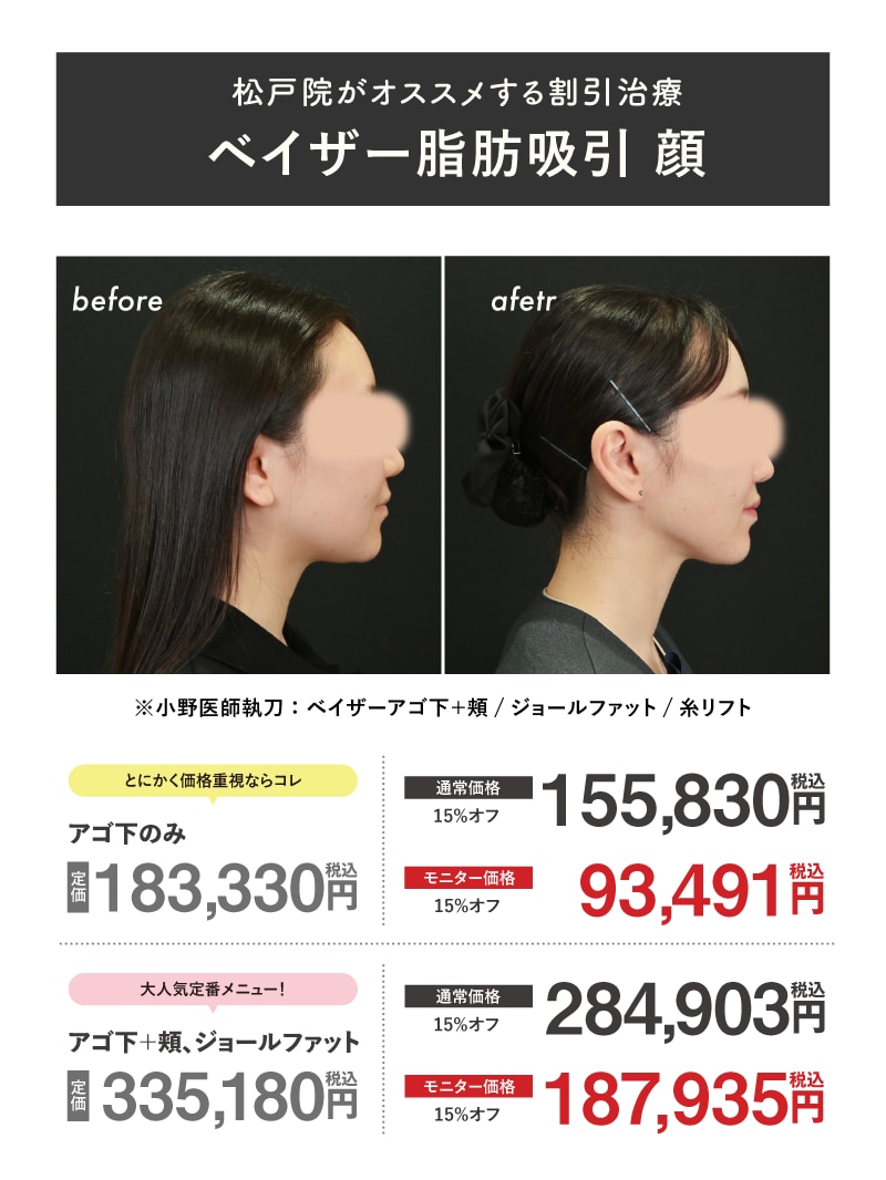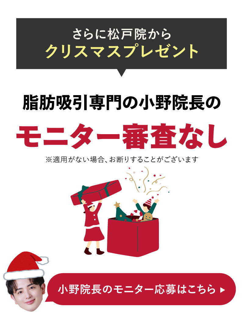 湘南美容クリニック松戸院では、肌質改善治療のリジュランHBや女優注射、医療脱毛(全身脱毛・VIO)、シミ取りレーザー、ピコレーザー、多汗症治療のミラドライなどの美容皮膚科処置はもちろんのこと、今大人気の顔の脂肪吸引、体(二の腕や太もも)の脂肪吸引、糸リフト(リフトアップ・小顔)、二重整形や目の下のクマ改善治療(クマ取り)などの外科治療もたくさん取り扱っています。特に松戸院では、脂肪吸引と肌質改善治療が大変人気です。ぜひ“人生が変わる脂肪吸引”を体験してみてください。アクセスは新京成線または常磐線「松戸駅」より徒歩4分です。まずはお気軽にお電話またはMySBCにてお問い合わせください。