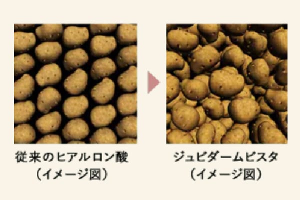 最近のヒアルロン酸は数年前に比べると断然長持ちしますが、ジュビダームバイクロスはさらに1年以上も効果が持続します。その秘密は、高分子と低分子のヒアルロン酸を配合していること。大きさが違うためにヒアルロン酸が効率的に、隙間なく密接に結びつき、強くなっているのです。