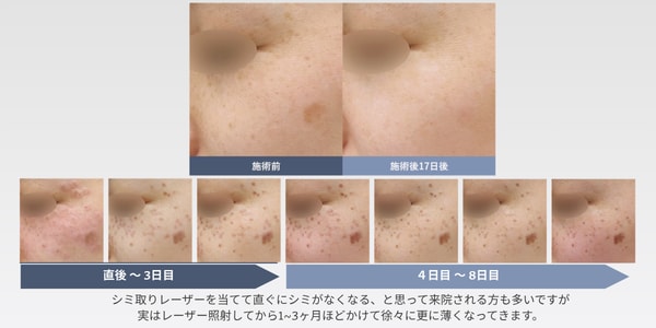 シミ取りレーザーを当てて直ぐにシミがなくなる、と思って来院される方も多いですが、実はレーザー照射してから1〜3ヶ月ほどかけて徐々に更に薄くなってきます。