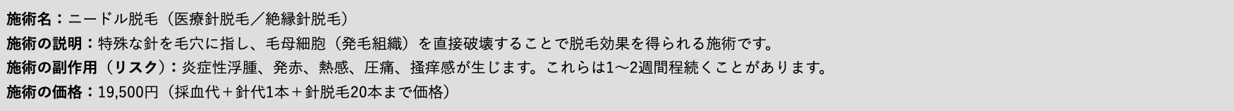 医療、クリニック、絶縁針等の記載がないニードル脱毛は、非医療機関の可能性が高いため、注意が必要です。