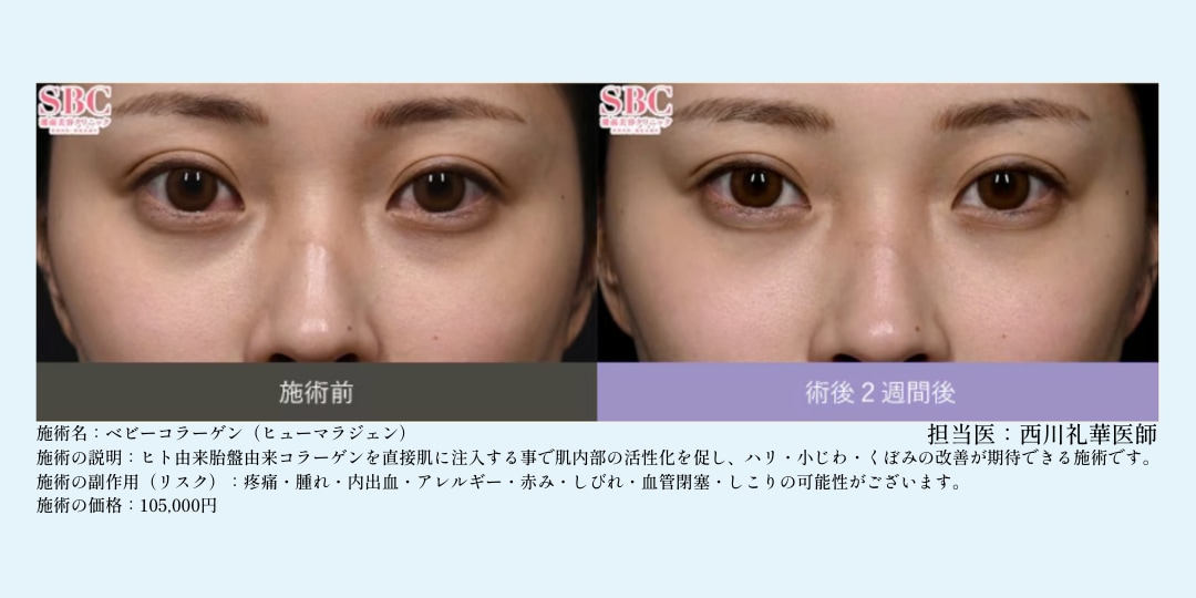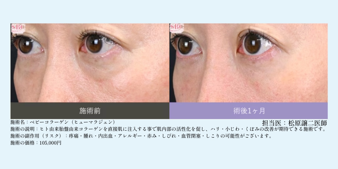 くぼみが強い部分はヒアルロン酸でくぼみを持ち上げて、目元などの細かいしわに関しては、ベビーコラーゲンの注入がおすすめです。