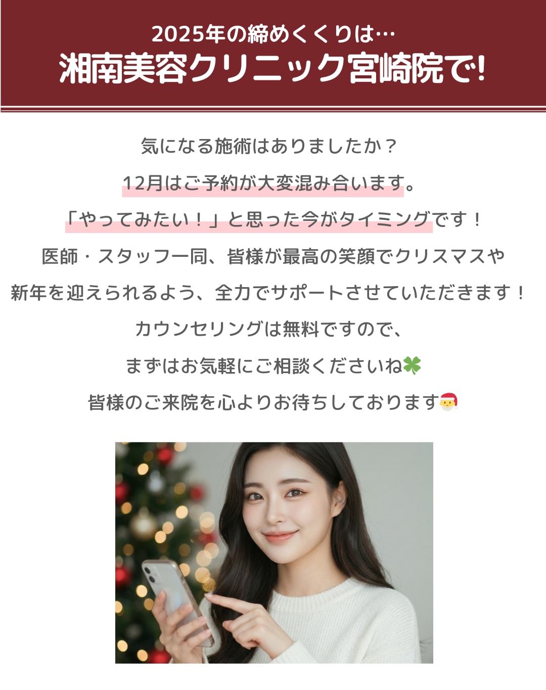 湘南美容クリニック宮崎院では、二重整形、クマ取り、脂肪吸引、糸リフト、豊胸術、婦人科形成などの美容外科治療をはじめ、医療脱毛(全身脱毛・VIO脱毛、メンズ脱毛)、医療ハイフ、シミ取り、薄毛治療、ヒアルロン酸、ボトックス、多汗症治療、痩身治療、美容皮膚科治療などを取り扱っております。
