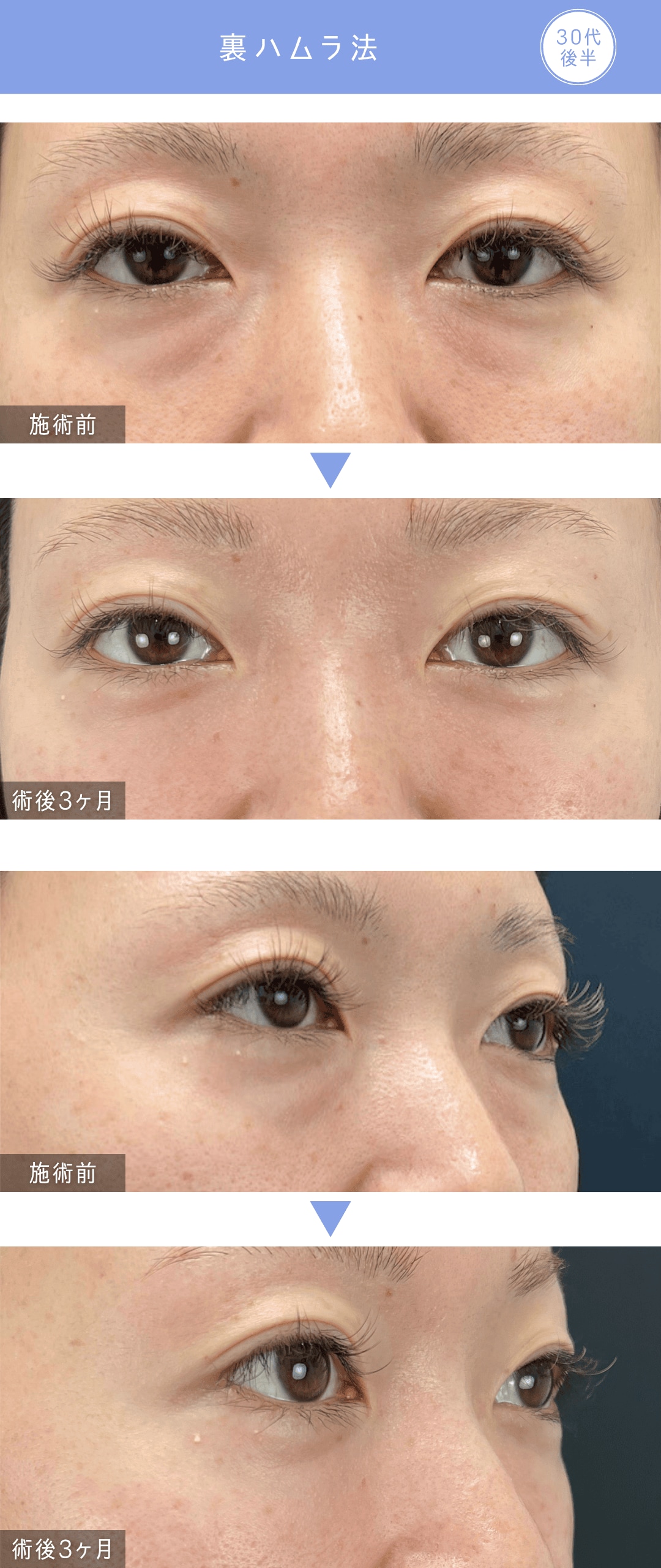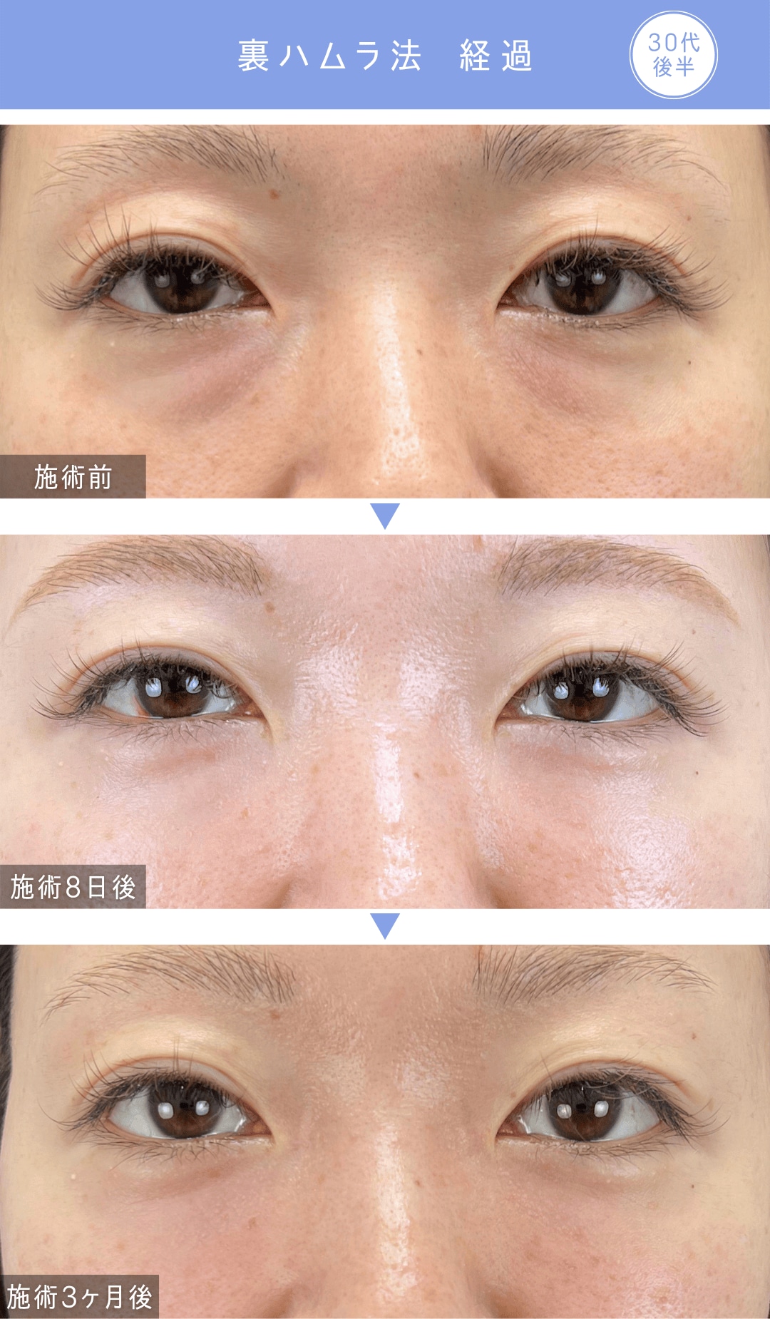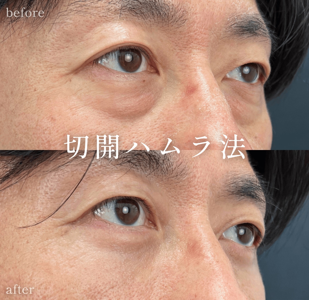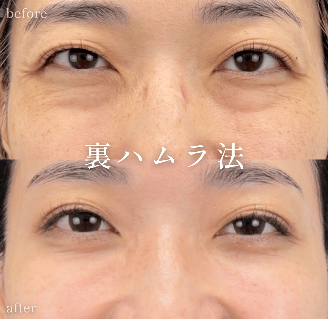 ハムラ法: ふくらみ(眼窩脂肪)を「取り除く」のではなく、その下にある「くぼみ」の部分に「移動(再配置)」する方法。