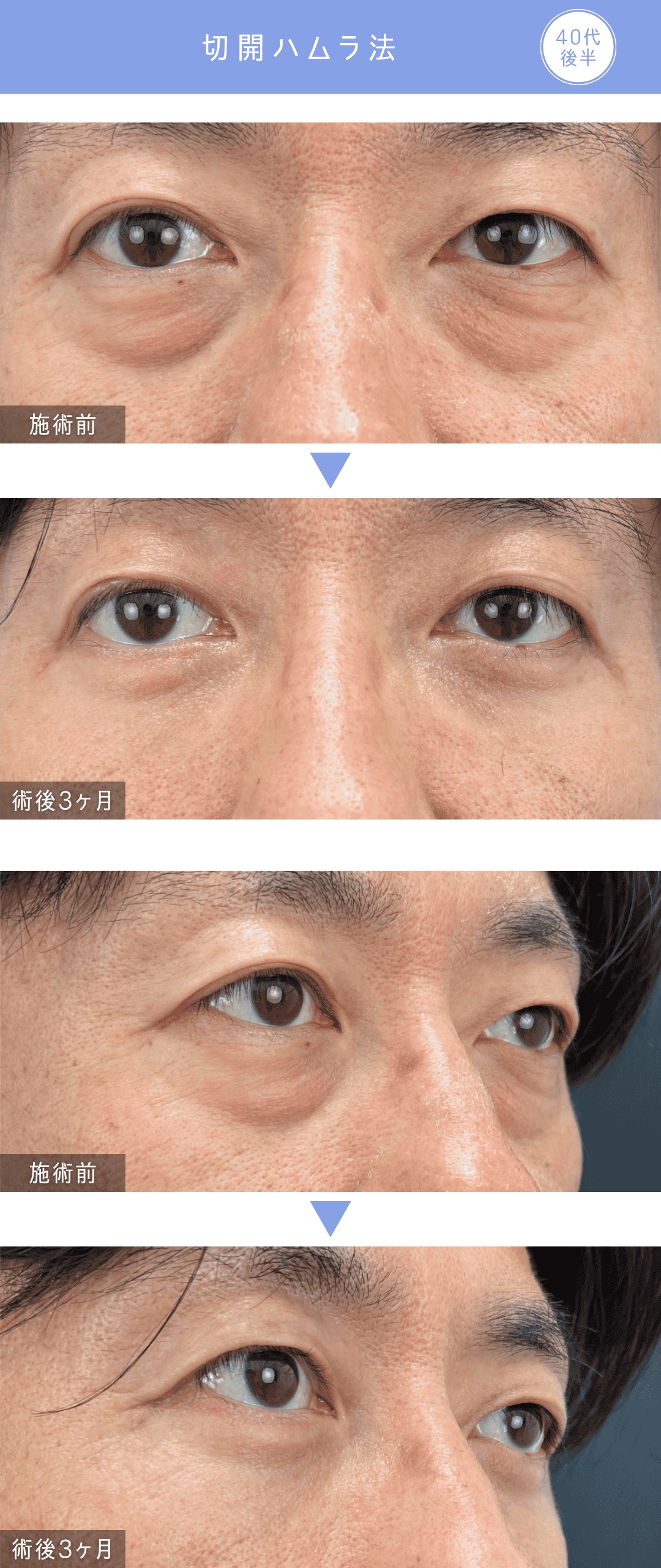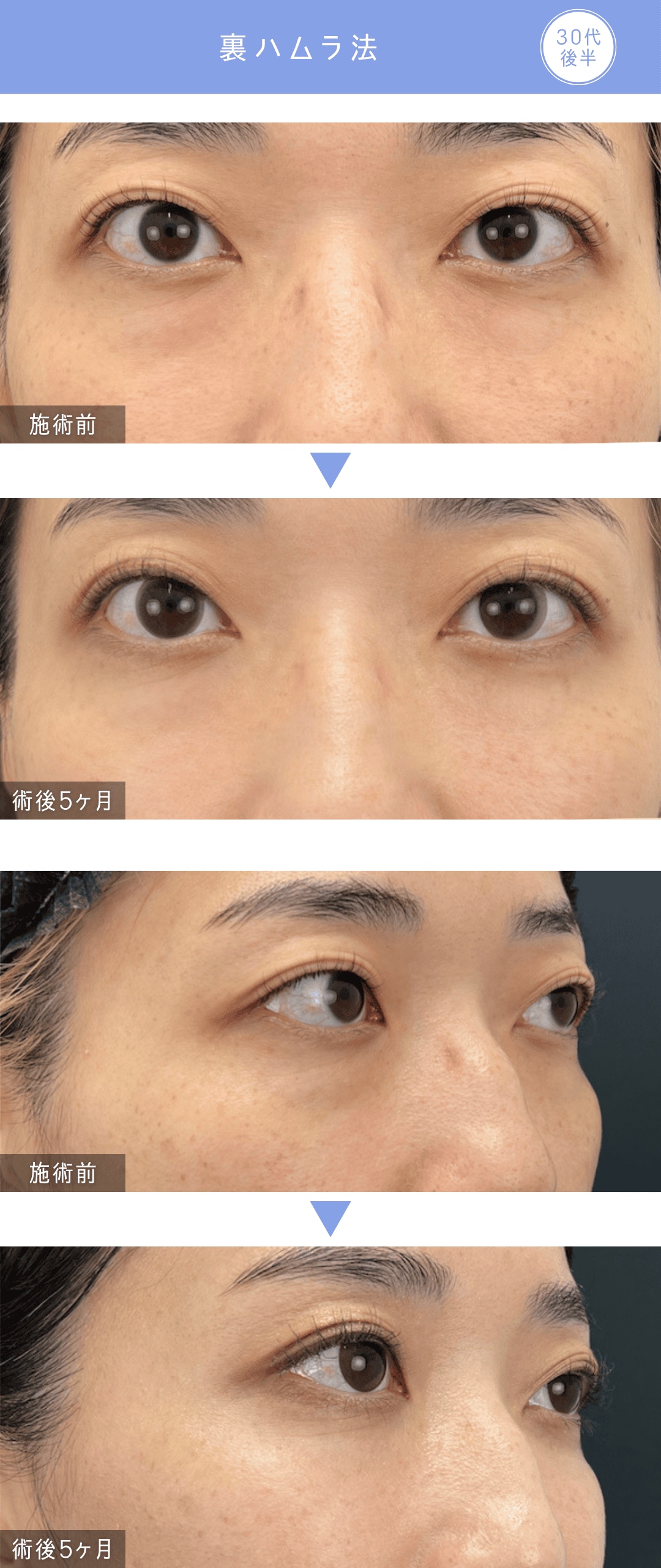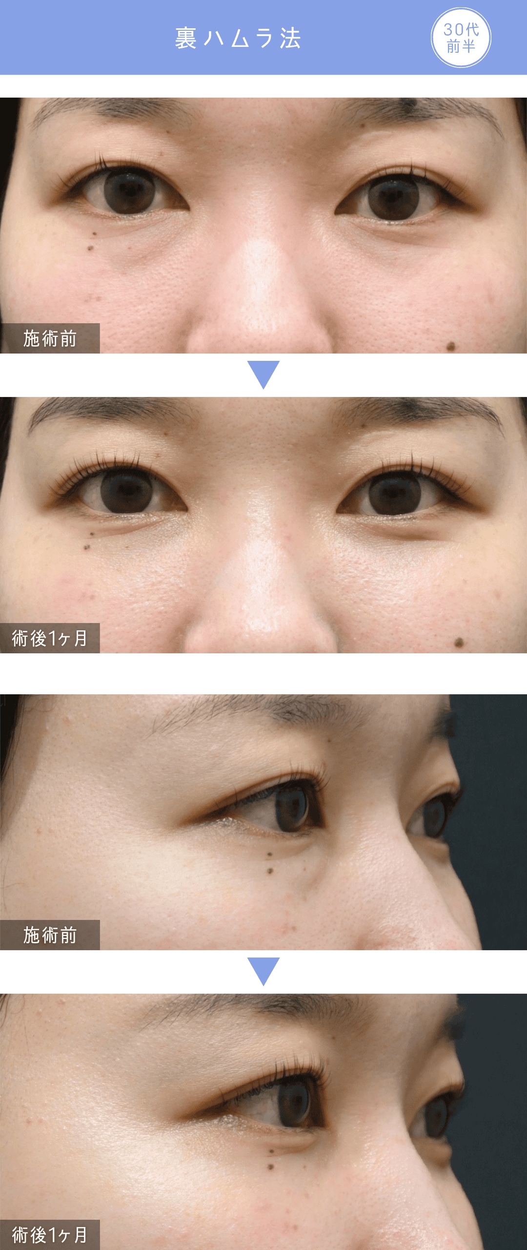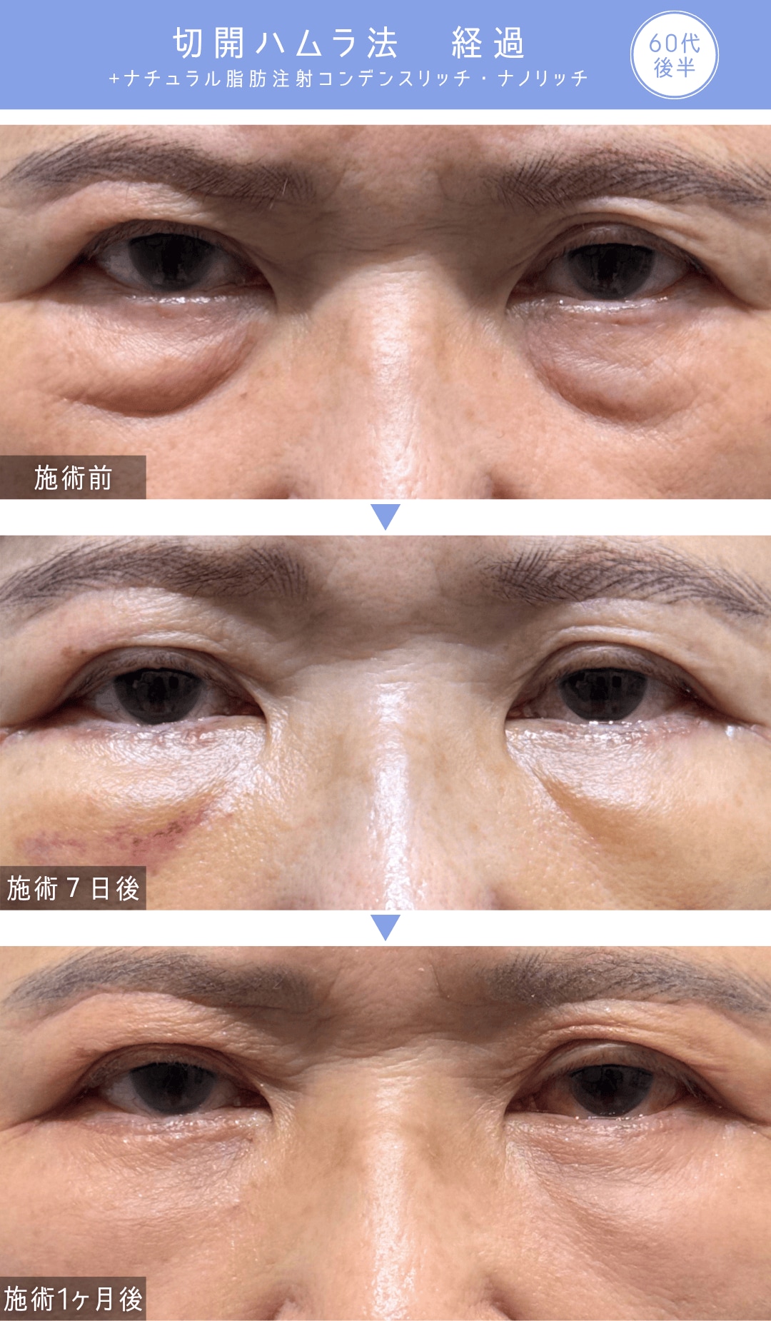ハムラ法: ふくらみ(眼窩脂肪)を「取り除く」のではなく、その下にある「くぼみ」の部分に「移動(再配置)」する方法。