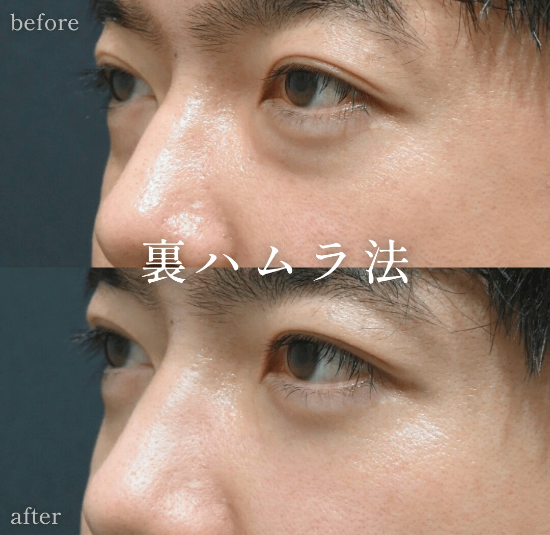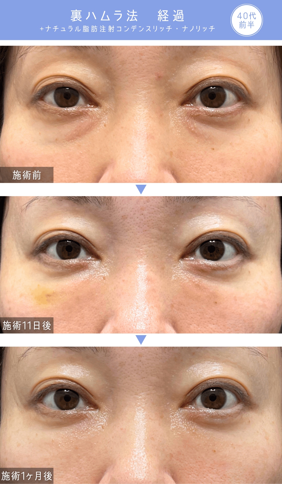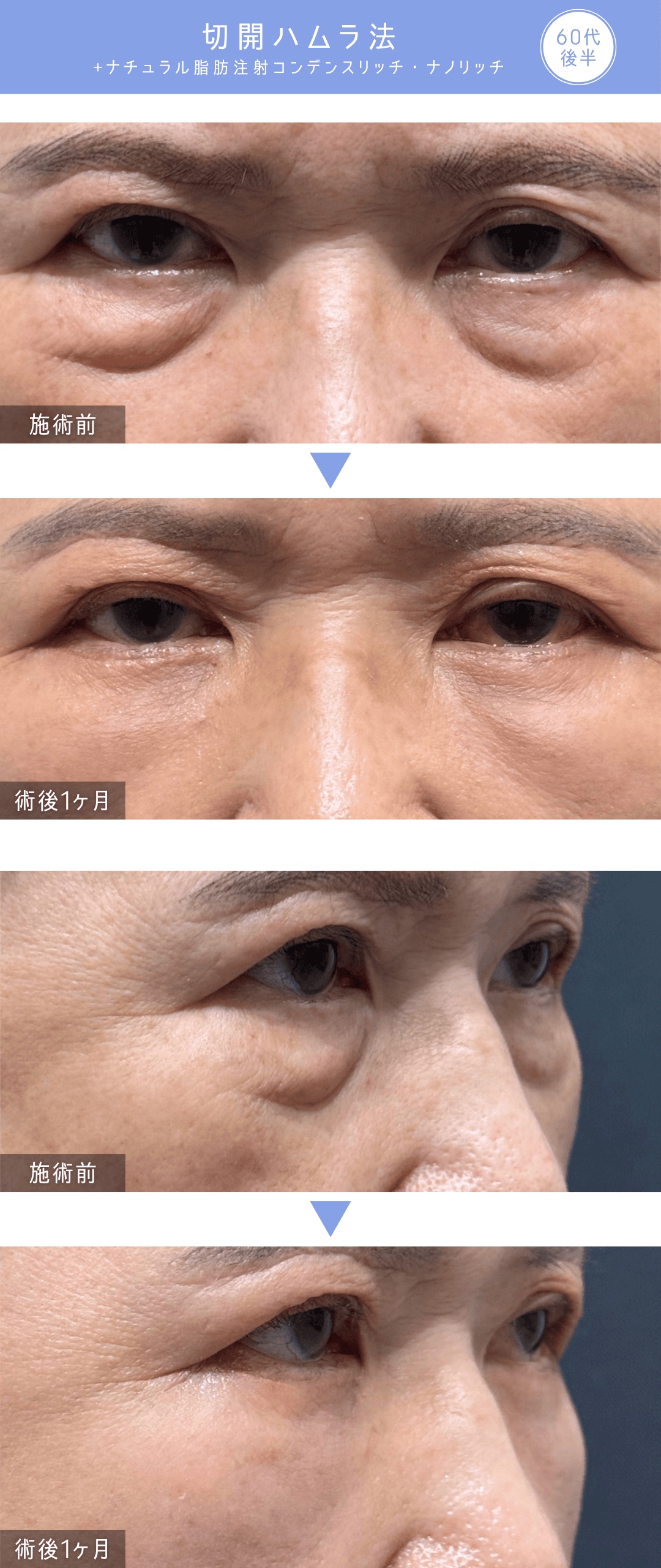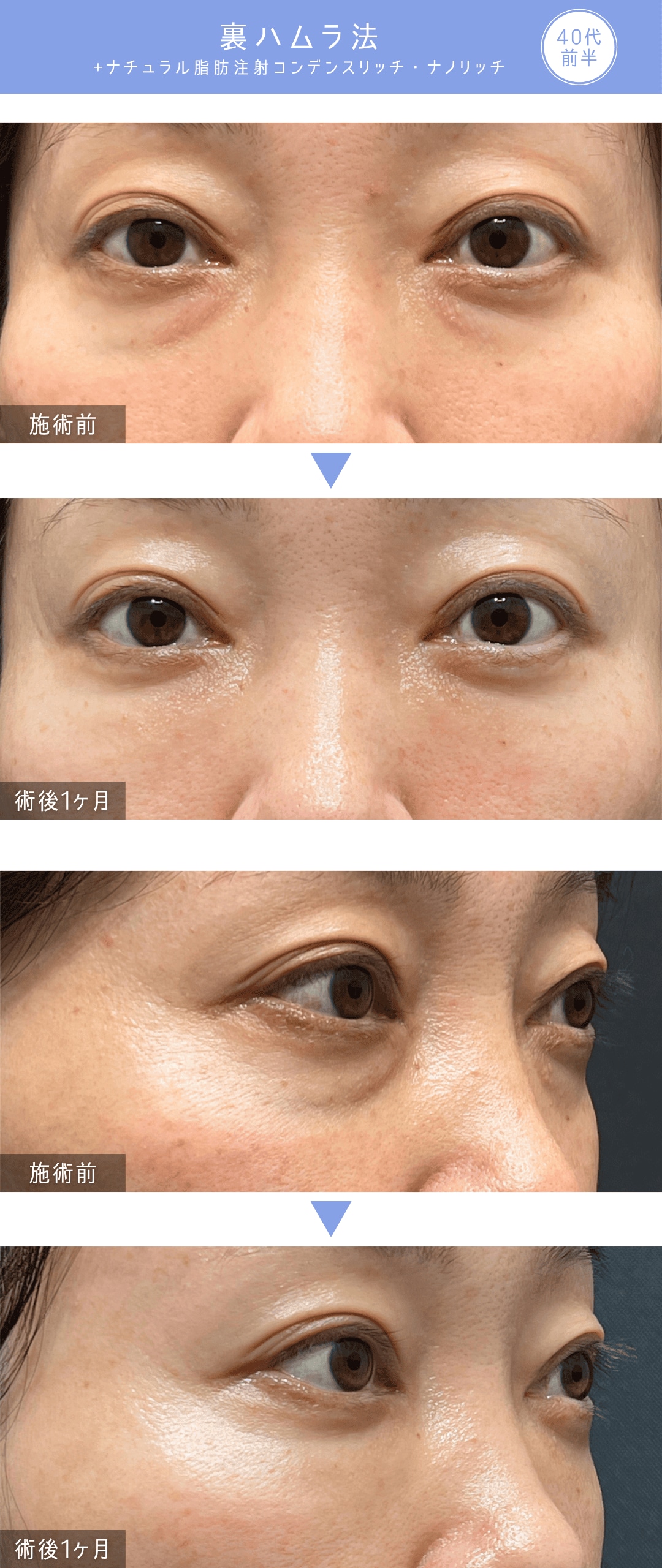 ハムラ法: ふくらみ(眼窩脂肪)を「取り除く」のではなく、その下にある「くぼみ」の部分に「移動(再配置)」する方法。