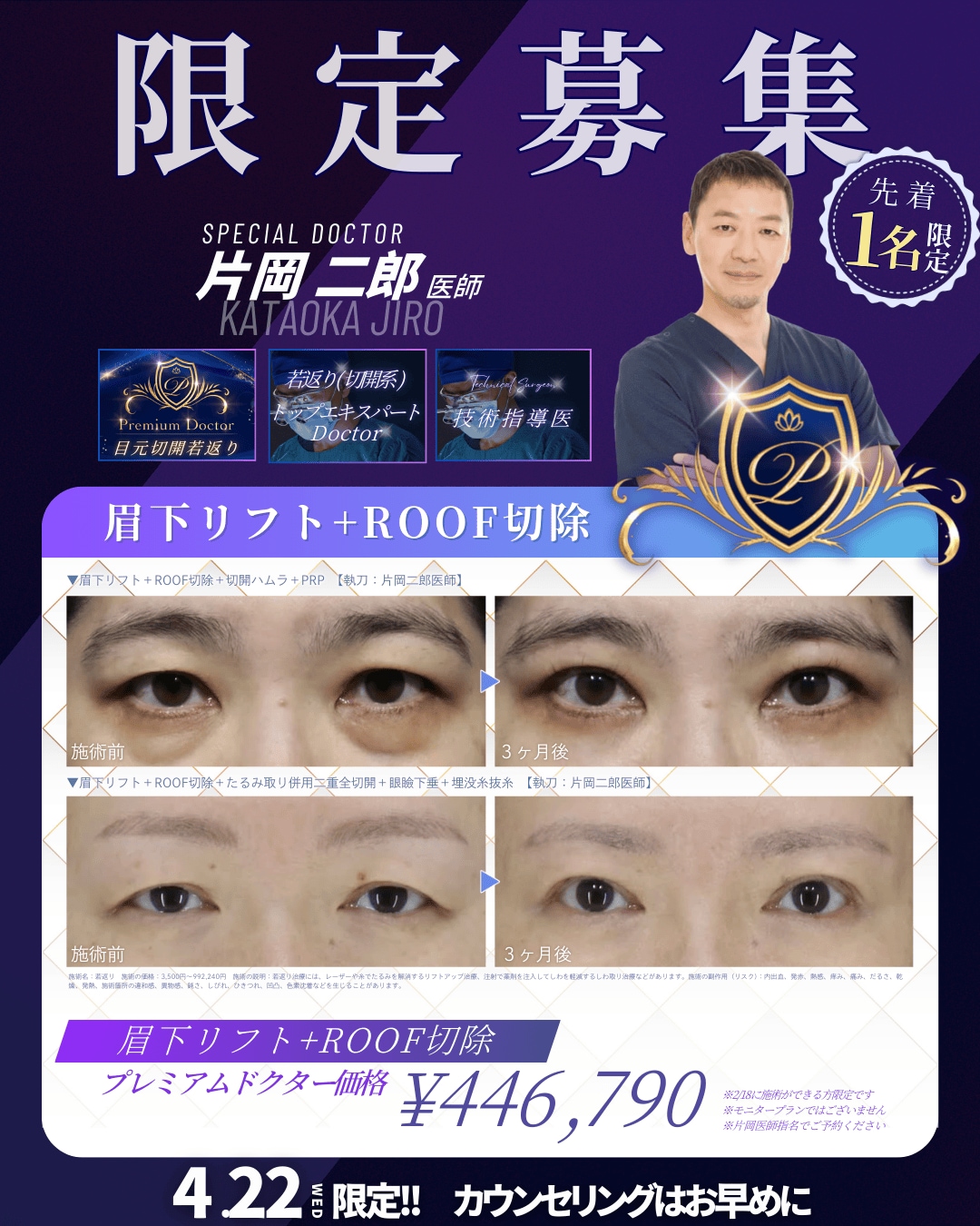 ご相談・ご予約の際は、必ず備考欄等に**「片岡医師・眉下リフトセット希望」**と明記してください。