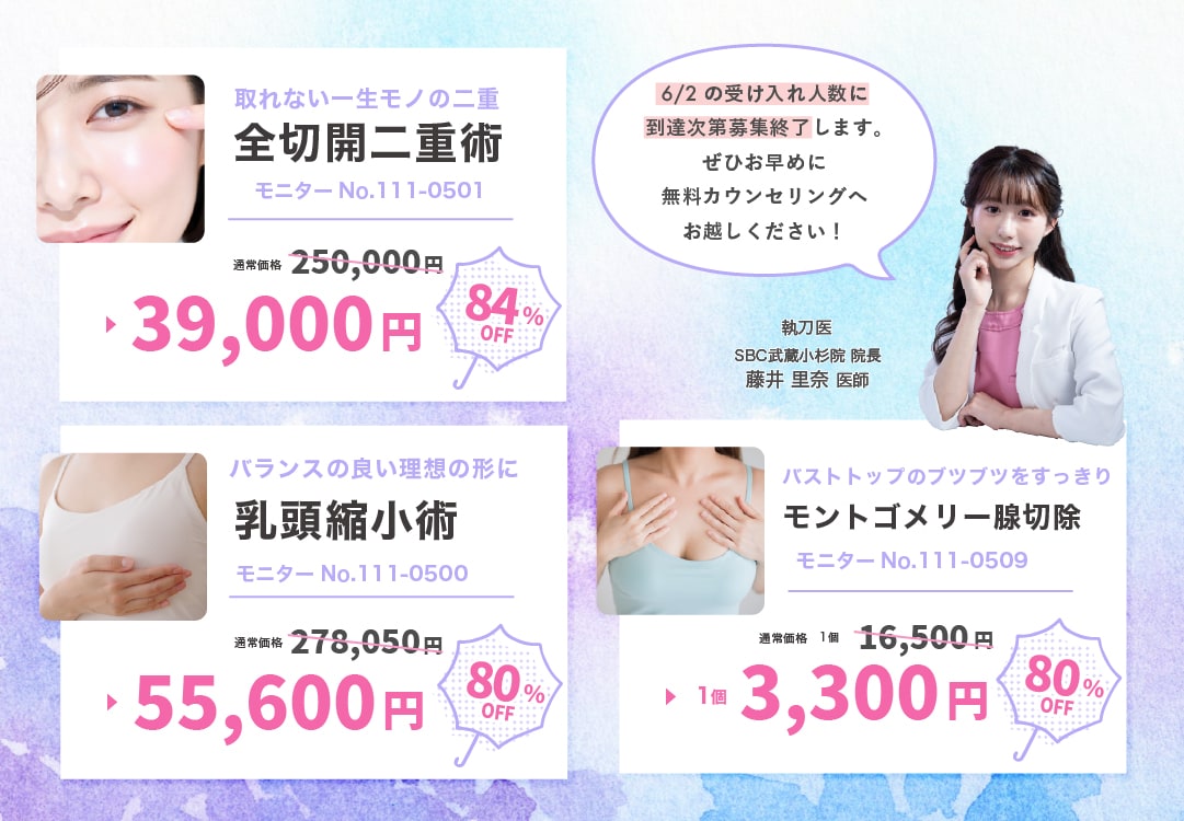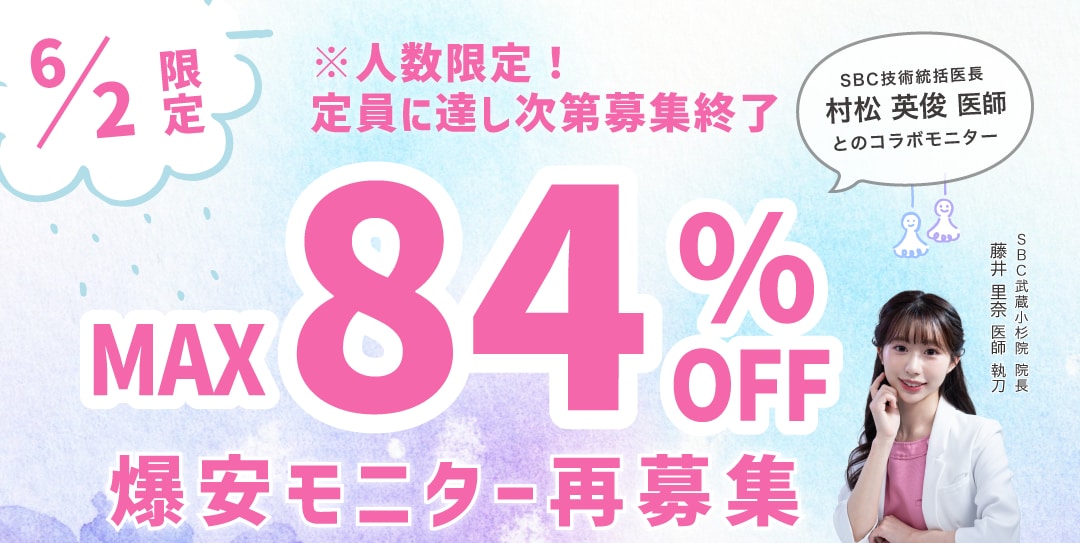 技術指導医のSBC技術統括医長 村松英俊医師が来院する限られた日程だからこそ実現した、今回限りの特別価格(最大84%OFF)でのご案内です。