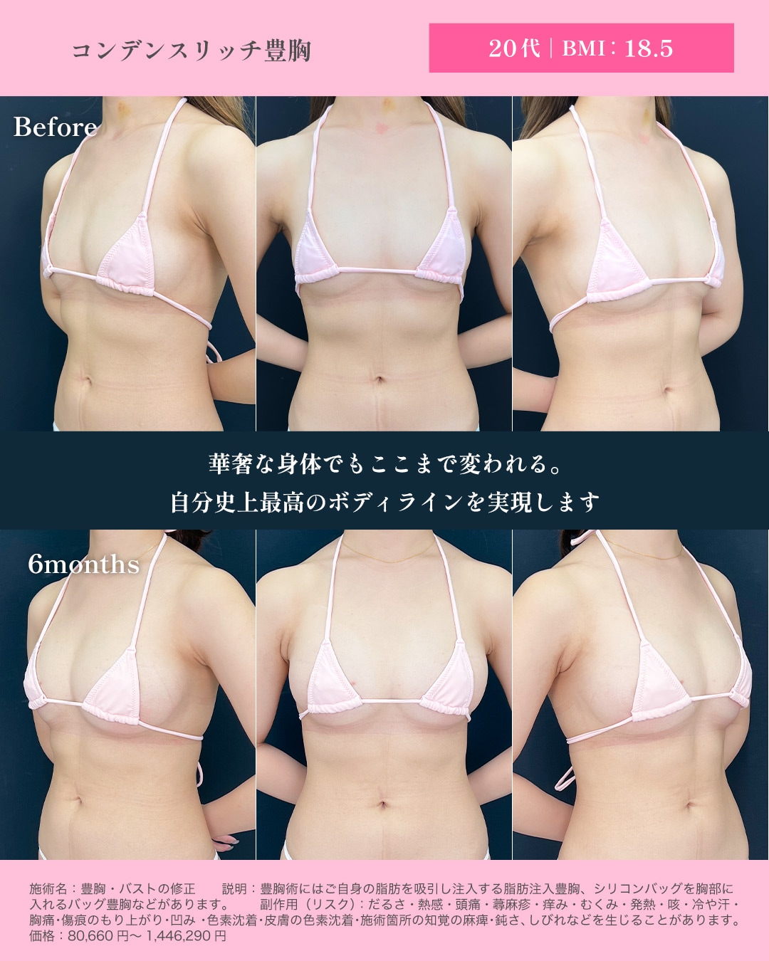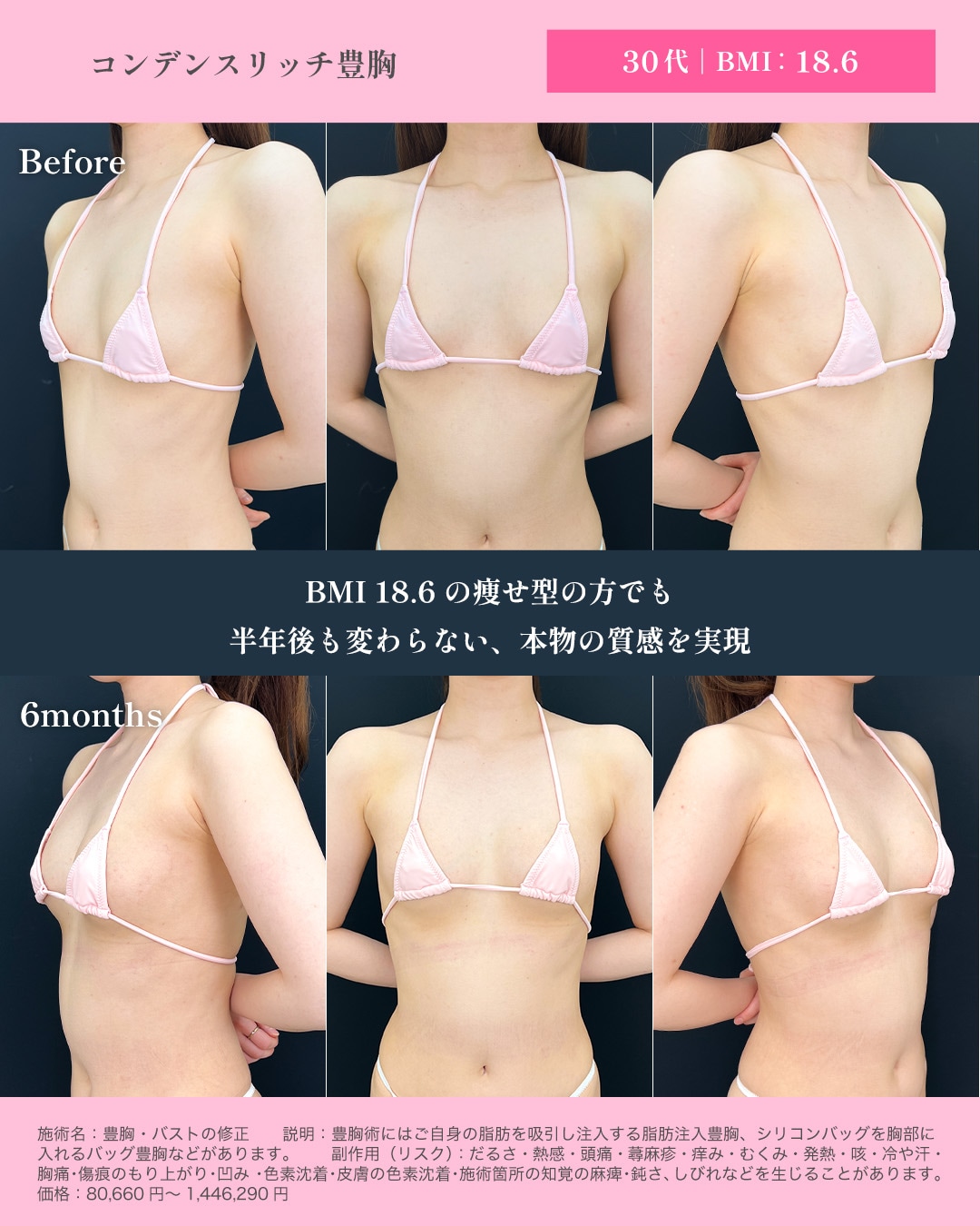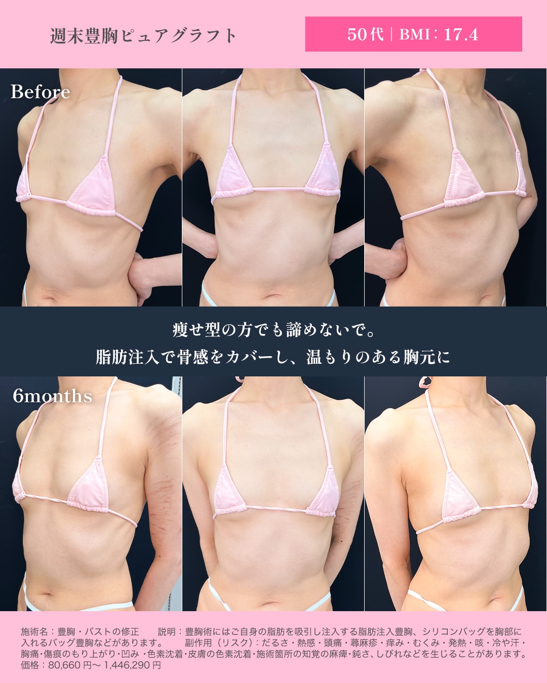 BMI 17.4という非常にスリムな体型ながら、肋骨の浮き出た印象が和らぎ、バスト周辺が健康的で若々しい印象に変わっています。