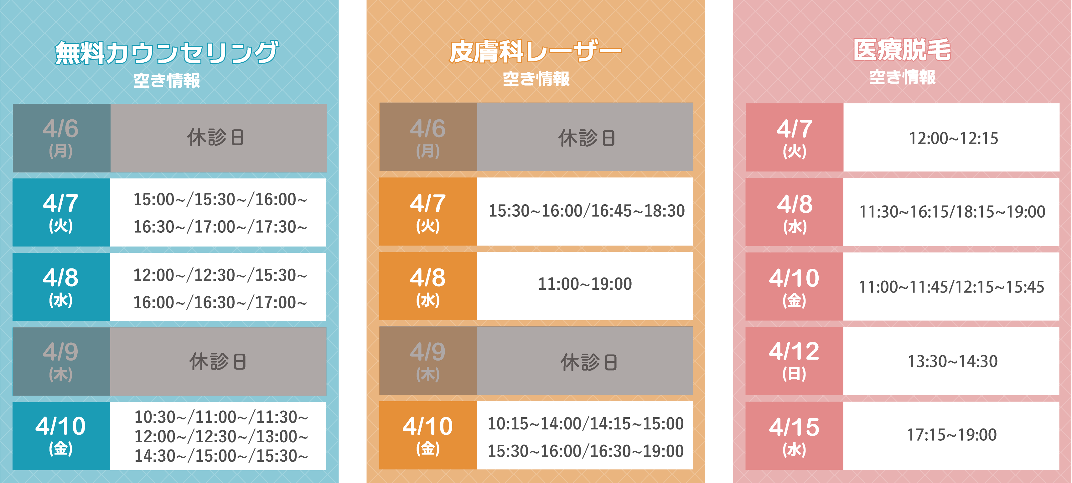 【最新空き情報】カウンセリング/レーザー/脱毛