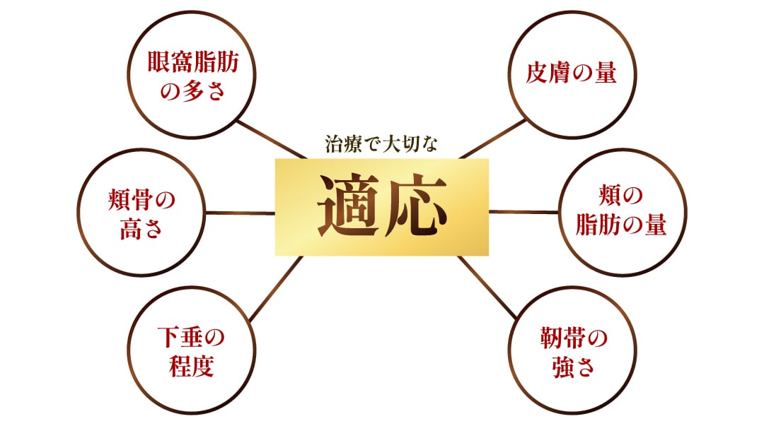 クマ治療で大切にしているのは適応。術前のクマの原因となっている眼窩脂肪の量、皮膚の量、頬骨の高さ、頬の脂肪の量と下垂の程度、靭帯の強さを全部含めて評価することが大切です。