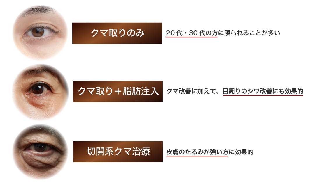 注意点として、クマ取りだけで改善する方は20代-30代前半に限られることがあげられます。クマ取りだけだと変化が難しい場合、脂肪注入やヒアルロン酸と組み合わせて治療をした方がより変化を実感し、且つ目の下のしわや皮膚余りを改善することができます。