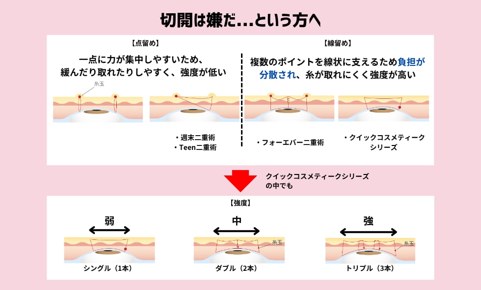 そこで進化した「線留め埋没法」はその弱点を改良し、糸で線を作ることで、格段に強度がアップしました。