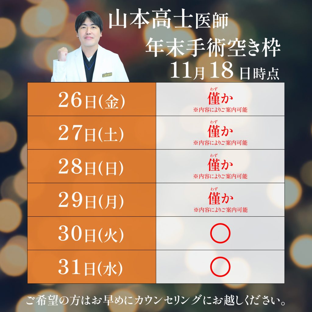 【年末予約最新状況】山本高士医師 年末予約受付中!【ご予約はお早めに】
