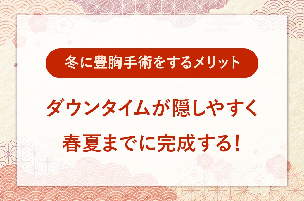 厚着になる冬はダウンタイム中の症状を周囲に気づかれずに過ごしやすく、豊胸を受ける方にとっては大きなメリットです。