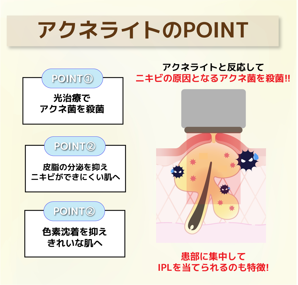 またアクネライト以外にも様々な治療の機械を多く用いているため、ニキビ治療をしながら他の美肌ケアのご提案をすることも可能◎