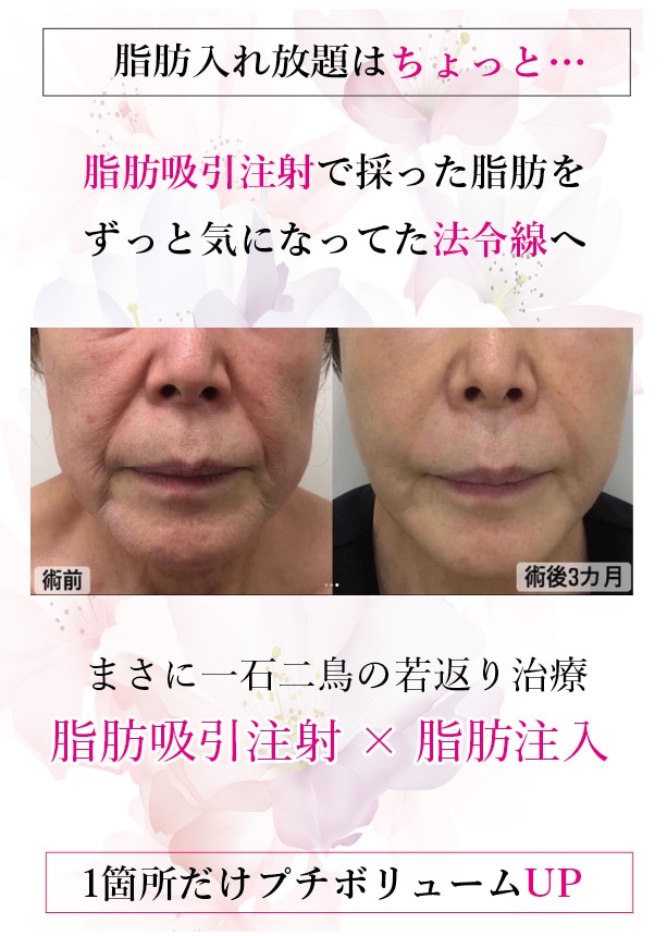 くっきりと年齢を感じるほうれい線は、皆が気になる所でもあり、人気の注入箇所です。