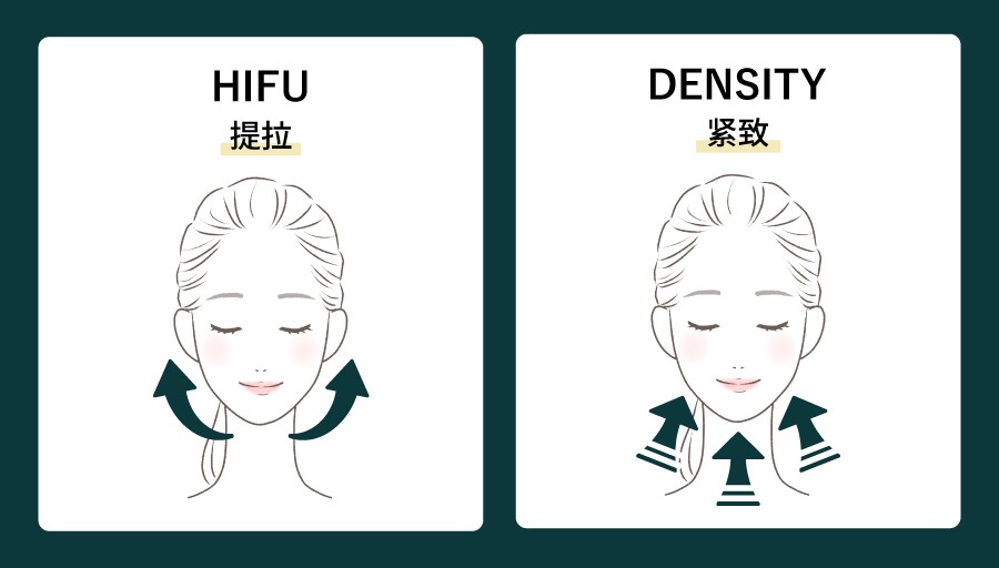 相比之下,DENSITY 主要以“面”的方式紧致整个皮肤表层,而 HIFU 则是以“点”的方式从基础层强力提拉。