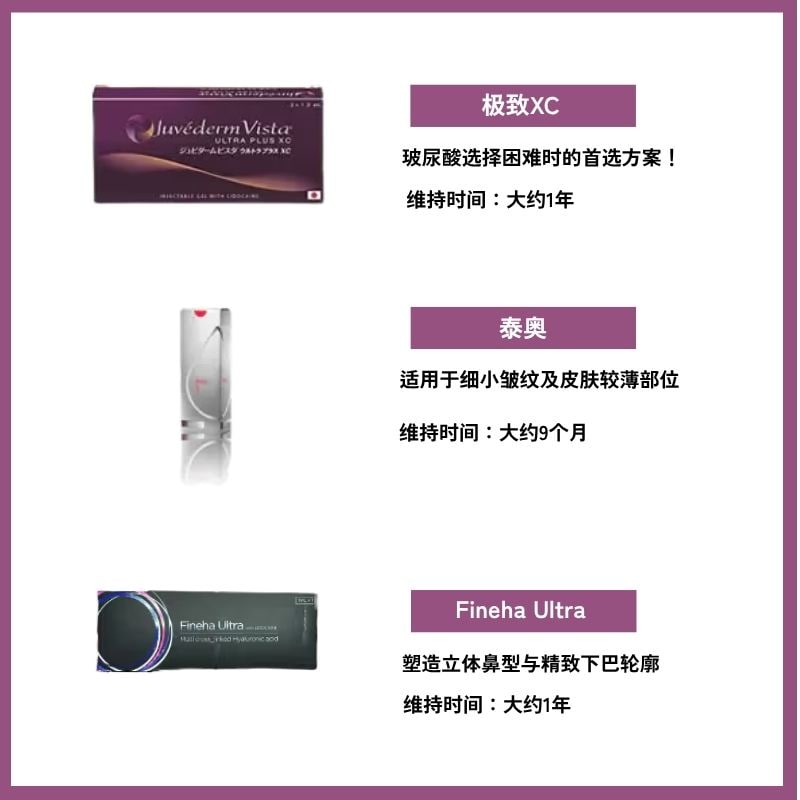 ◎泰奥:与传统玻尿酸相比质地更为细腻柔软,适用于眼周等皮肤较薄部位以及细小皱纹的改善。
