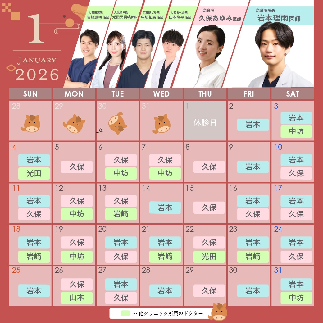 AM10:00~PM7:00 最終カウンセリング予約PM5:30まで ※休診日/なし(※1/1は休診、その他特別休診の場合があります) |