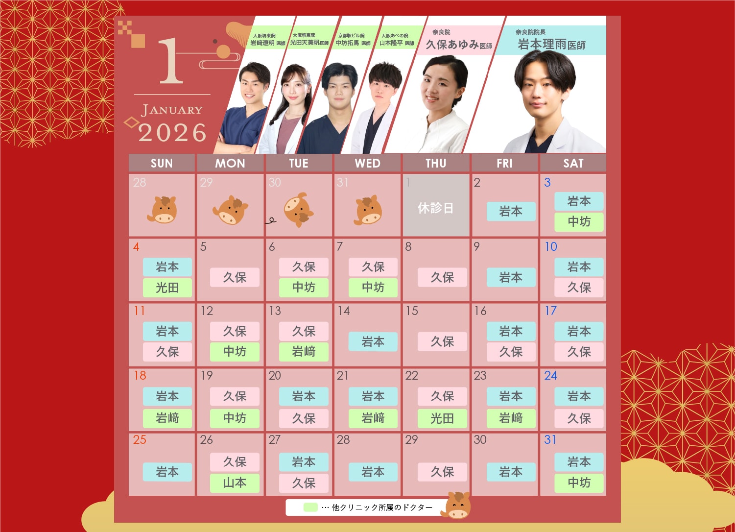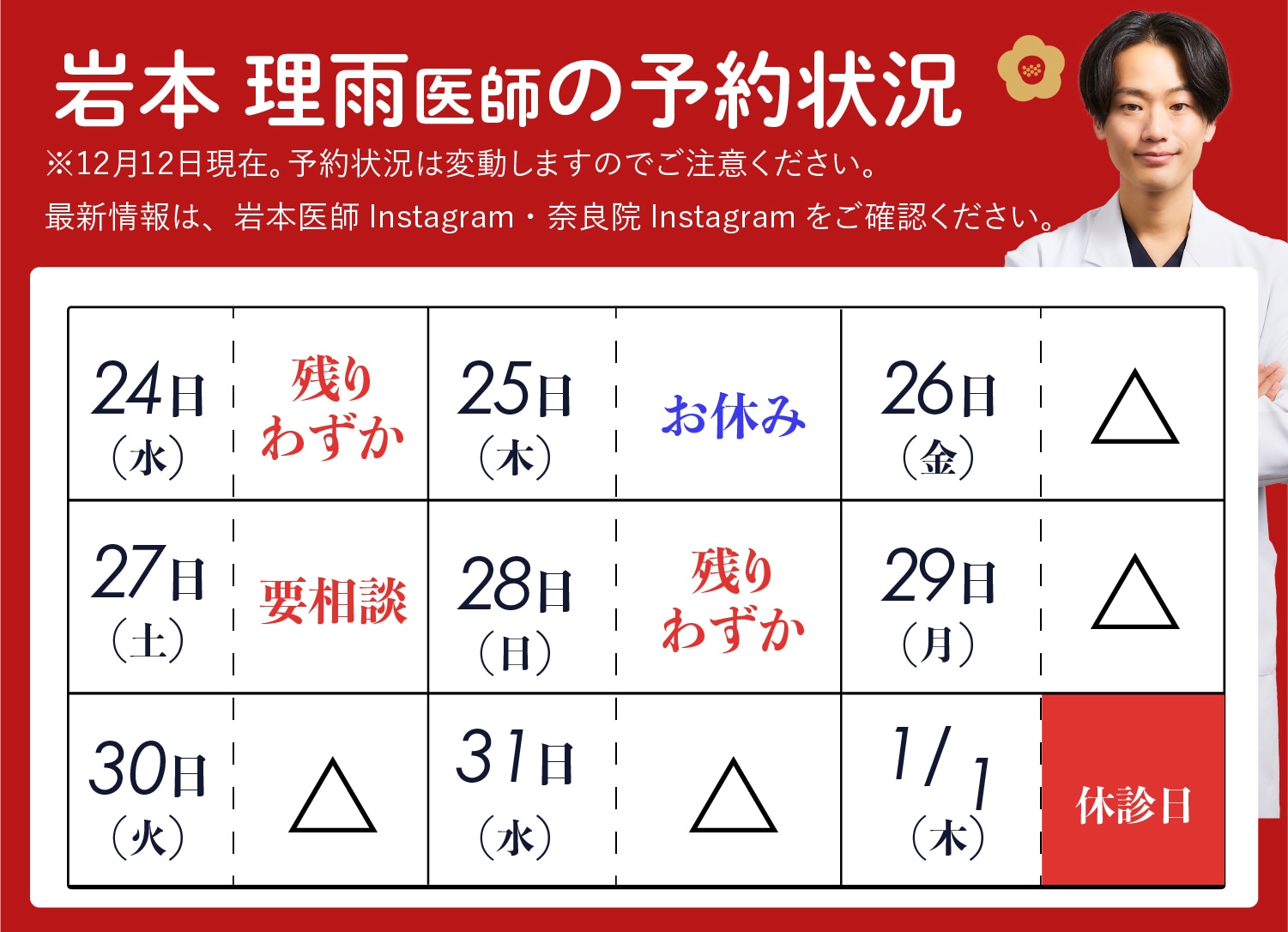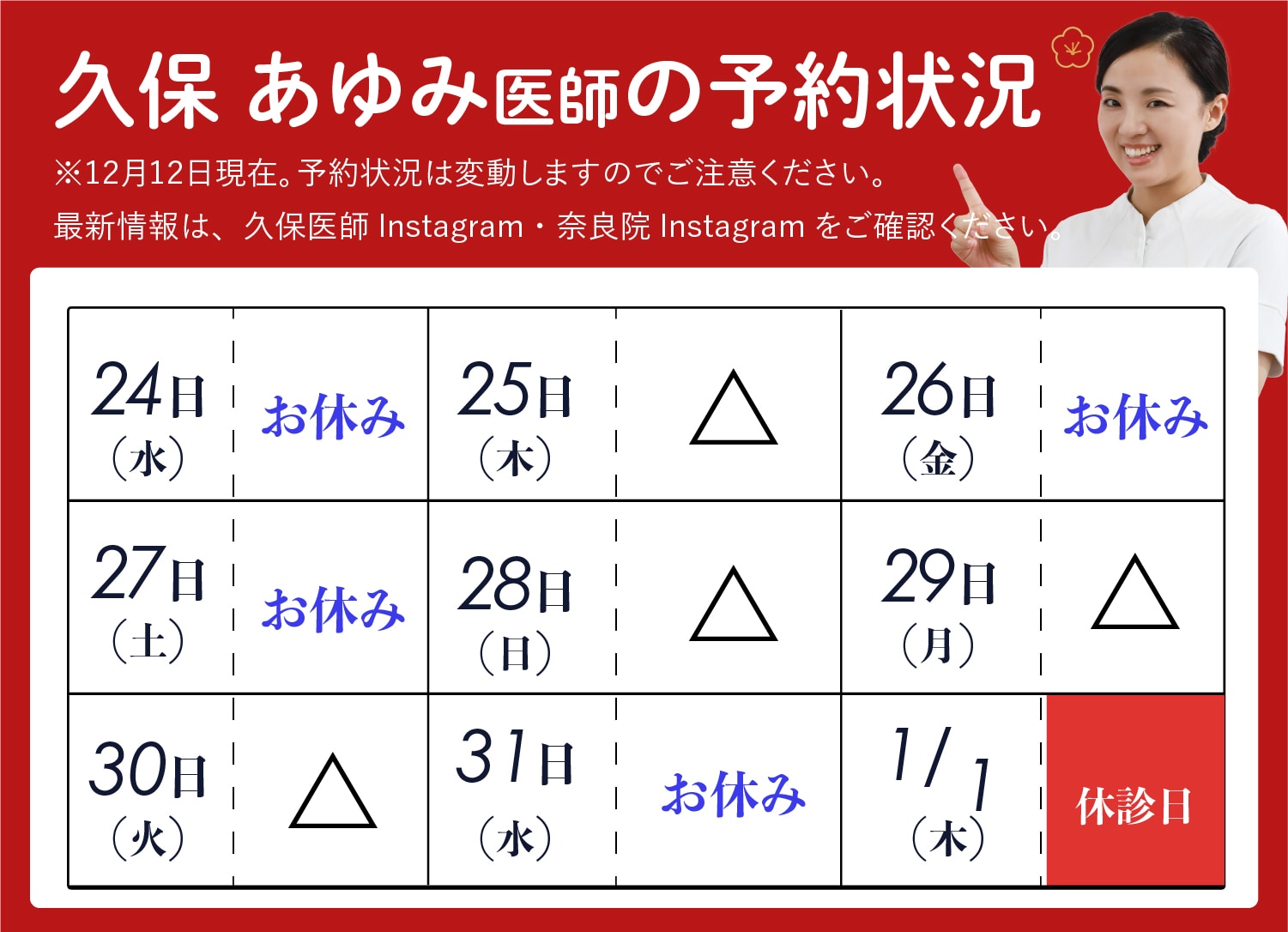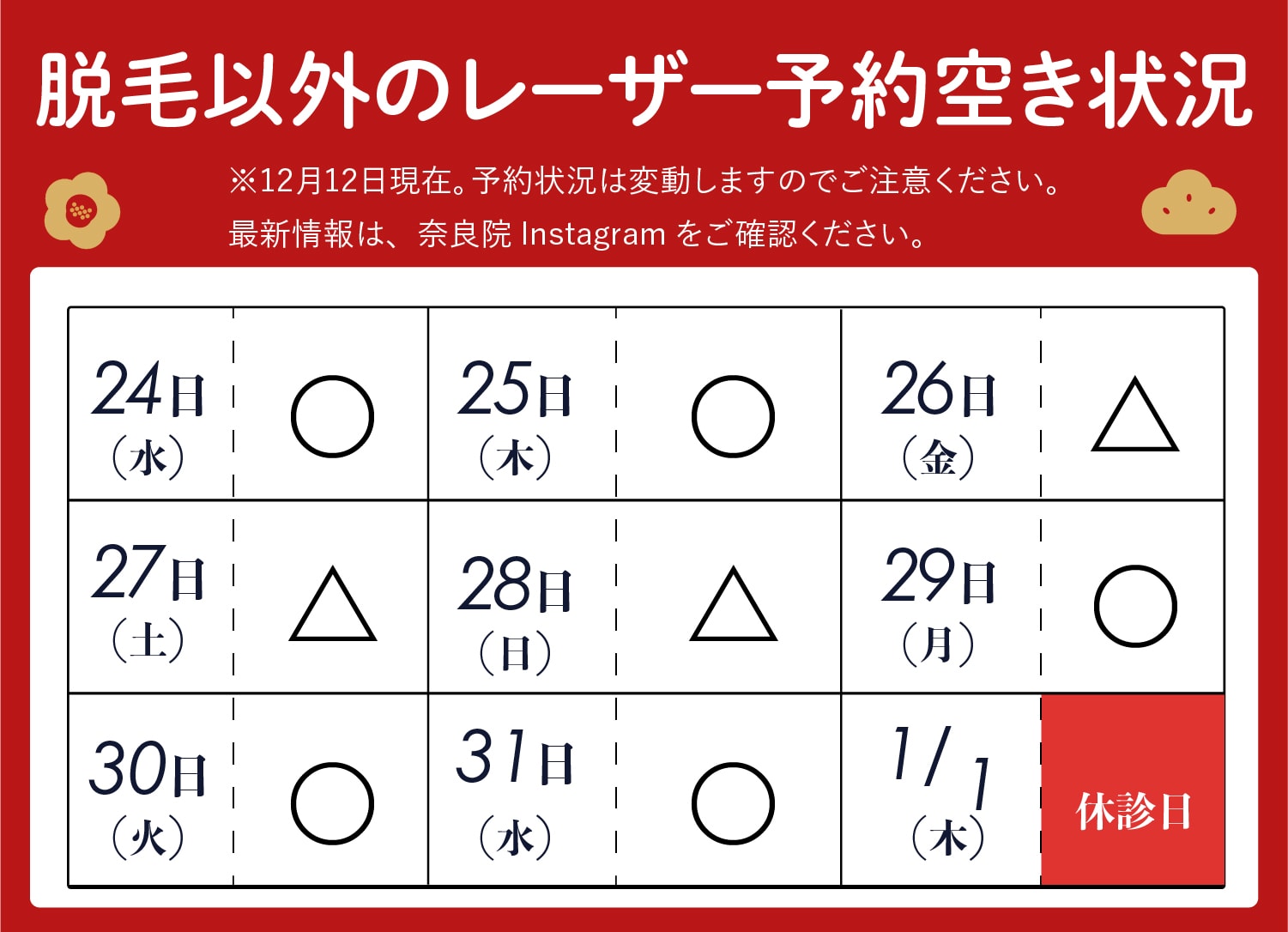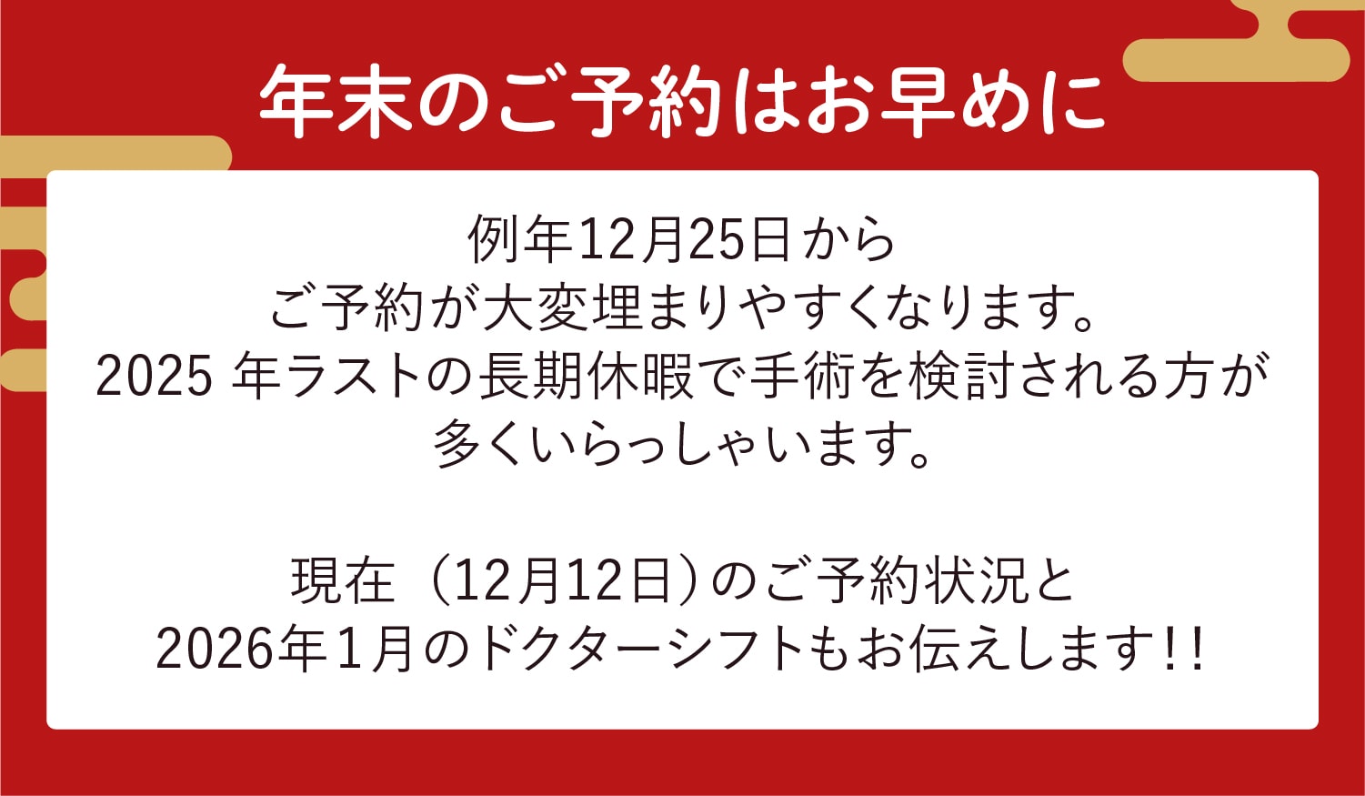 AM10:00~PM7:00 最終カウンセリング予約PM5:30まで ※休診日/なし(※1/1は休診、その他特別休診の場合があります) |