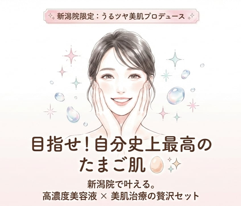 万代エリアでお買い物ついでに賢くキレイを目指しませんか?新潟院限定の「うるツヤ美肌プロデュース」で、自分史上最高のたまご肌へ✨