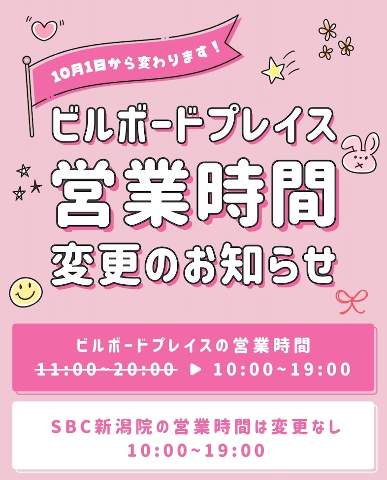 【10/1~】ビルボードプレイス営業時間変更のお知らせ