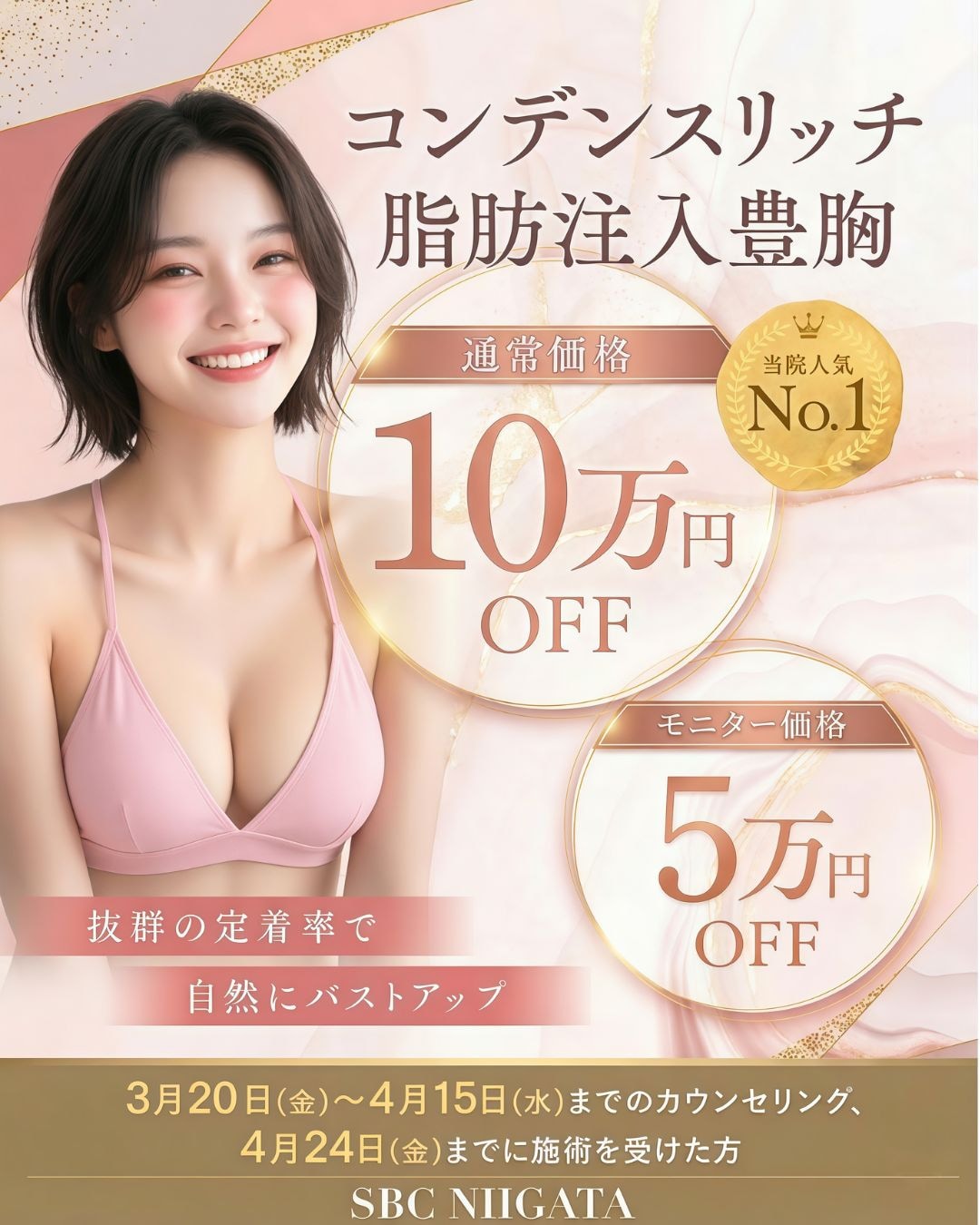クリニック案内 新潟県のクリニック 湘南美容クリニック 新潟院 【10万円オフ】豊胸(コンデンスリッチ脂肪注入)が期間限定でお得に受けられる❣️