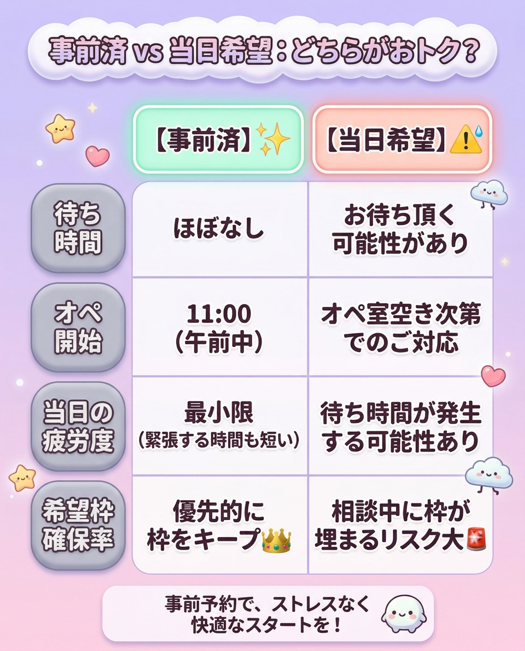 ※当院は予約優先制です。GW期間中は大変混み合うため、お早めのご予約をおすすめいたします。事前カウンセリングを済ませておくことで、当日のお手続きが非常にスムーズになります。